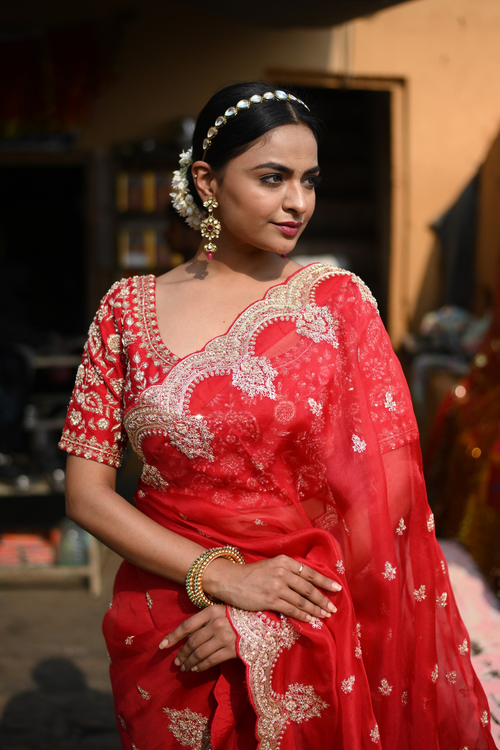 - Apple Red Organza Saree Has Beautiful Royal Heritage Motives Of Floral And Geometric Designs.