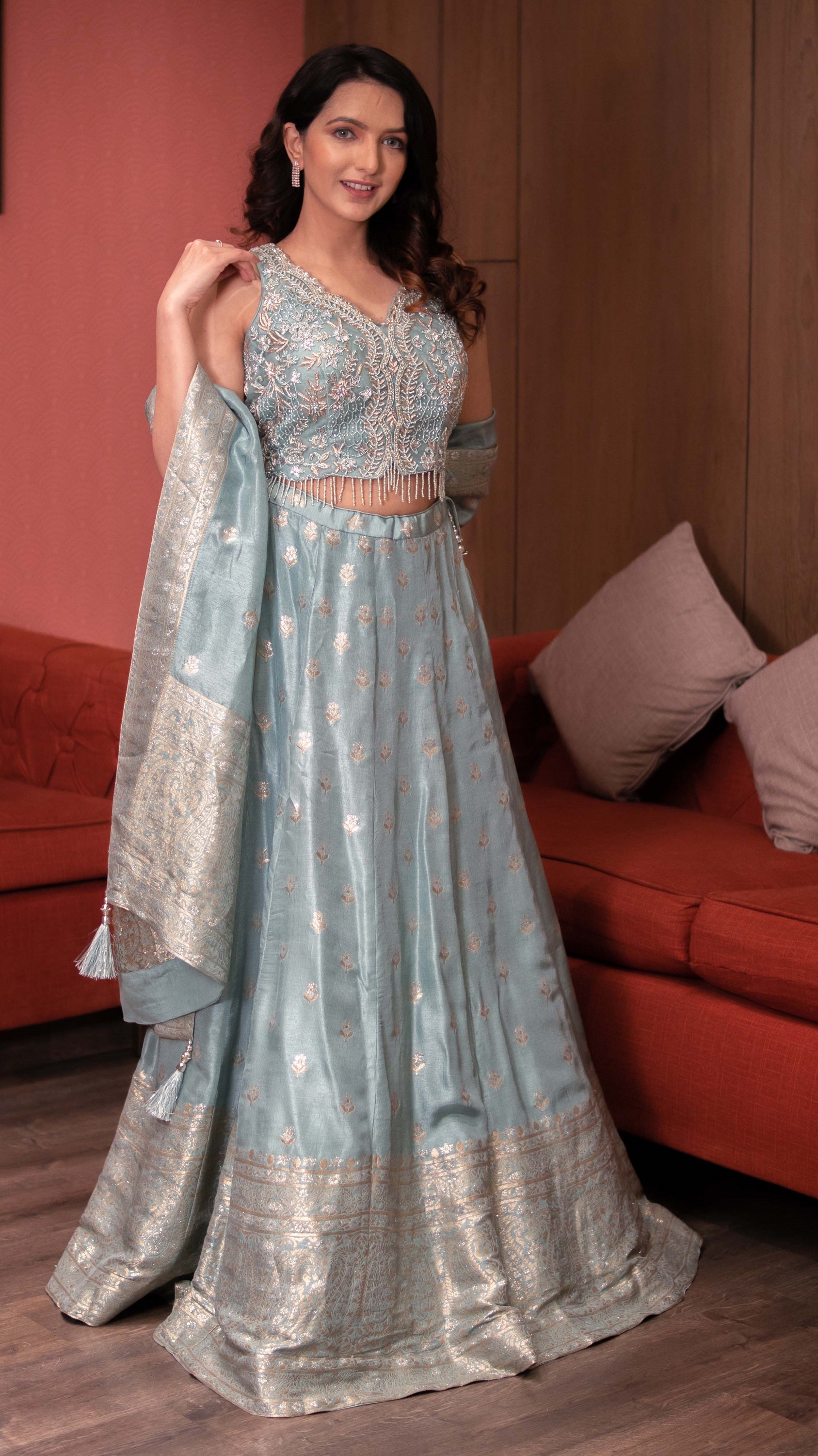- Aqua Green Raw Silk Banarasi Skirt With Crop Top And Dupatta.