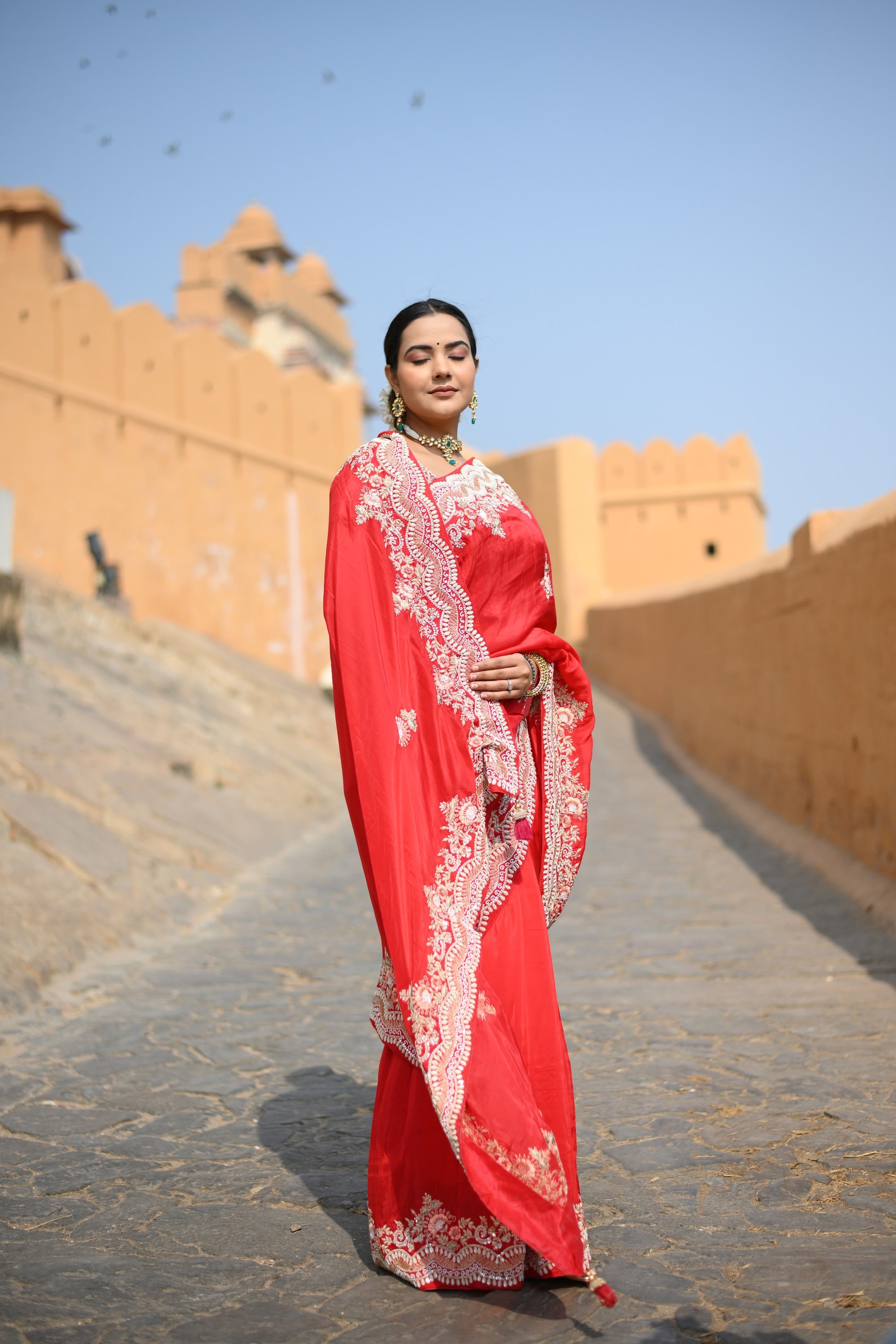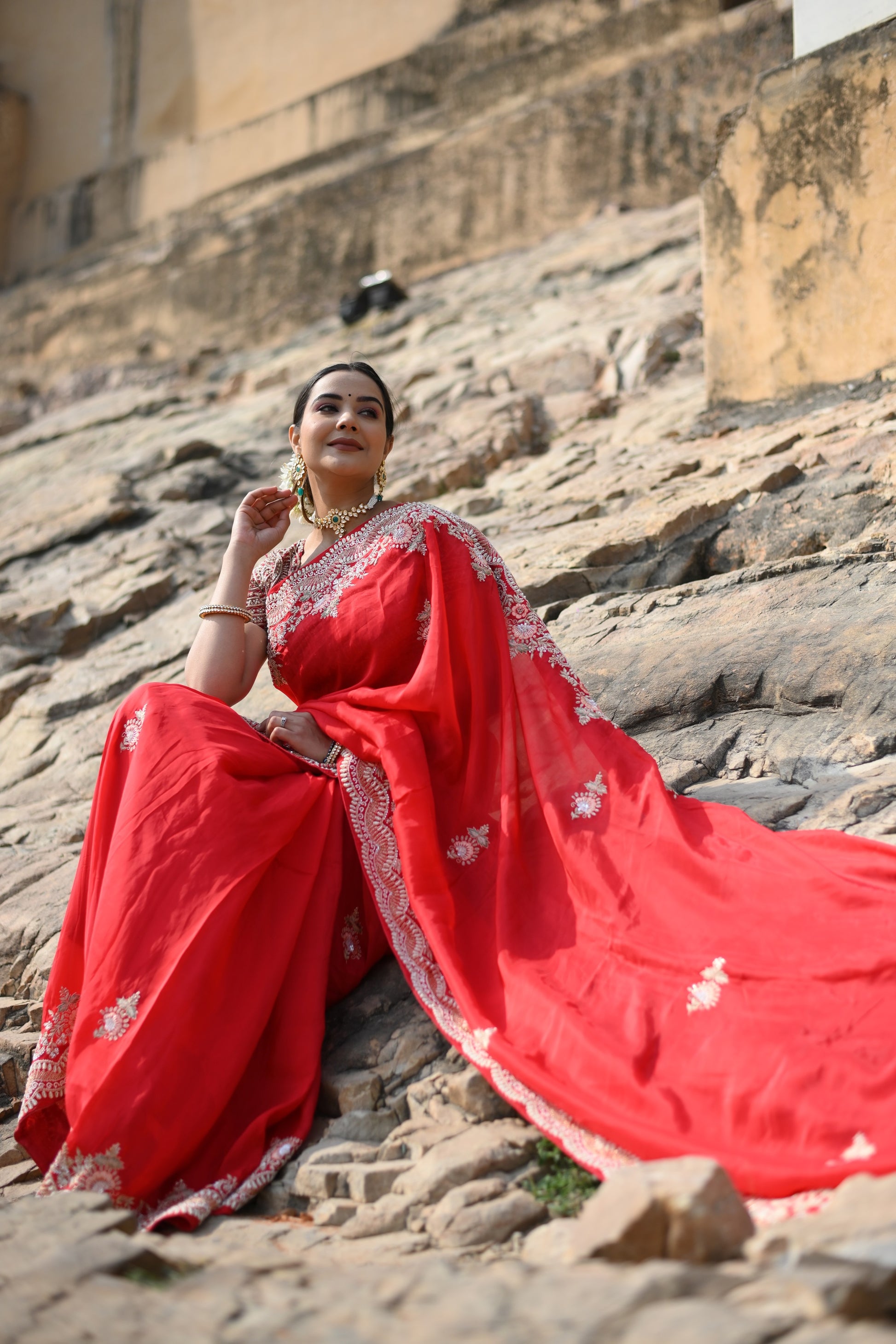 - Candy Red Pure Organza Saree Is Embellished With Moti, Cut Dana, Sequin, Zardozi, And Resham Hand Work.