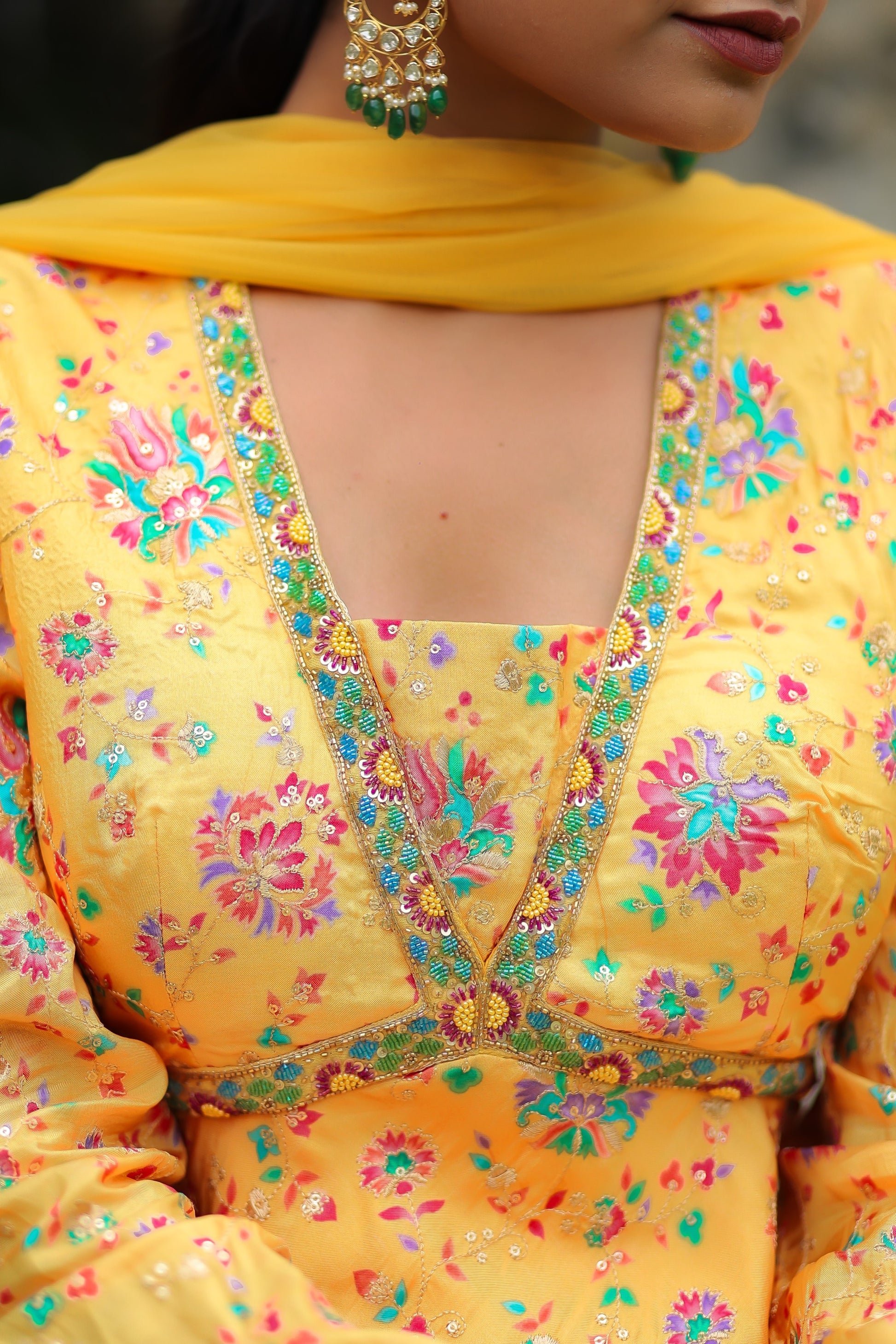 - Chrome Yellow Floral Printed Peplum Top Made In Dola Silk With Zari And Sequin Highlighting On The Print Giving It A Detailed Look.