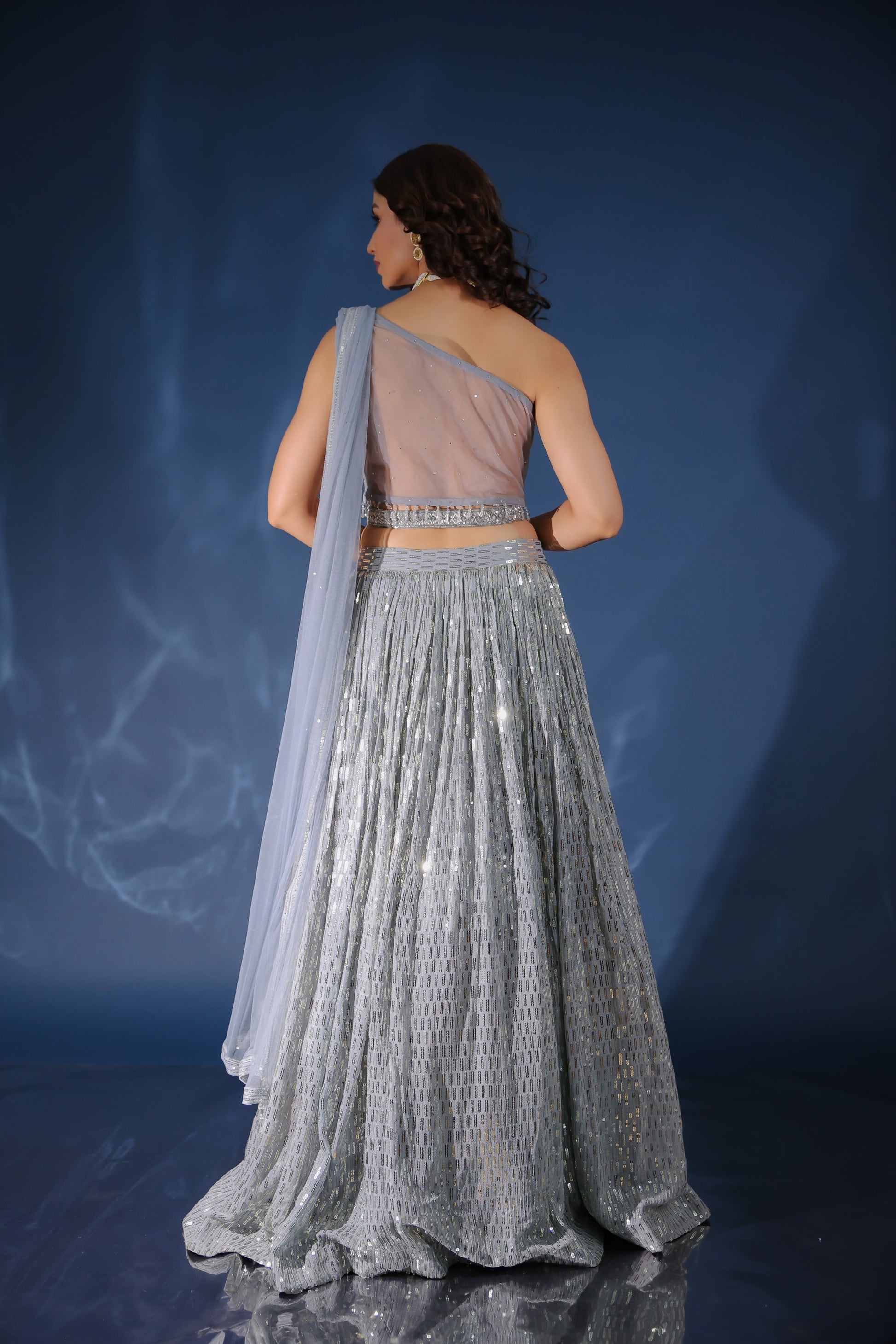 - Cloudy Grey Sequin Asymmetric Neck Padded Crop Top In Georgette Fabric Having Tube And Moti Tassel At The Waist Line.