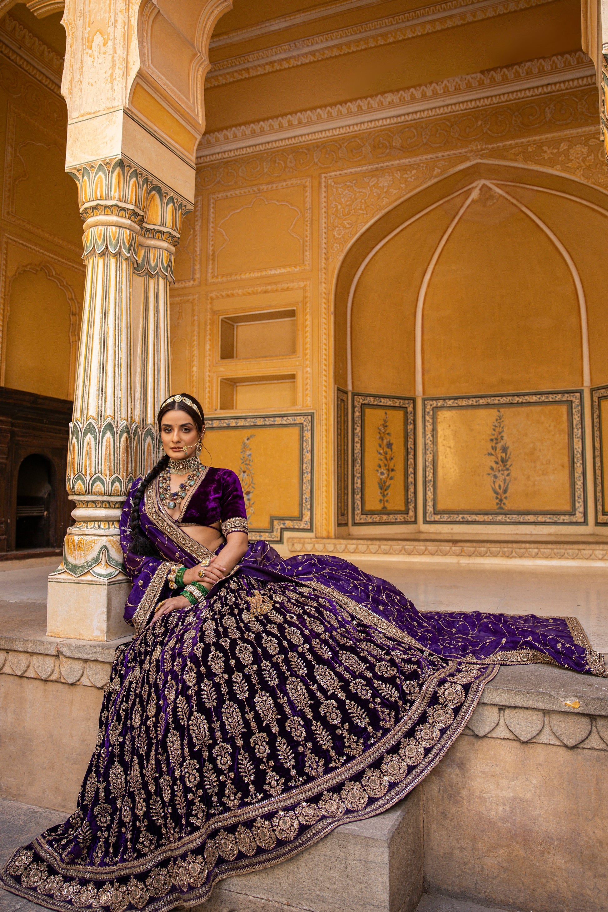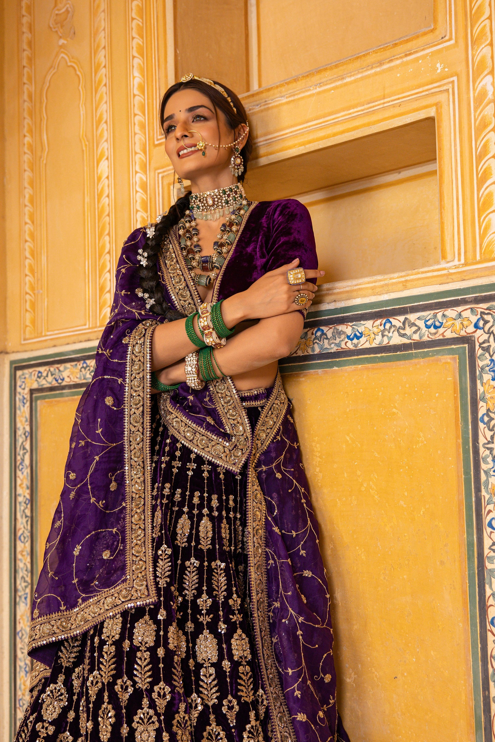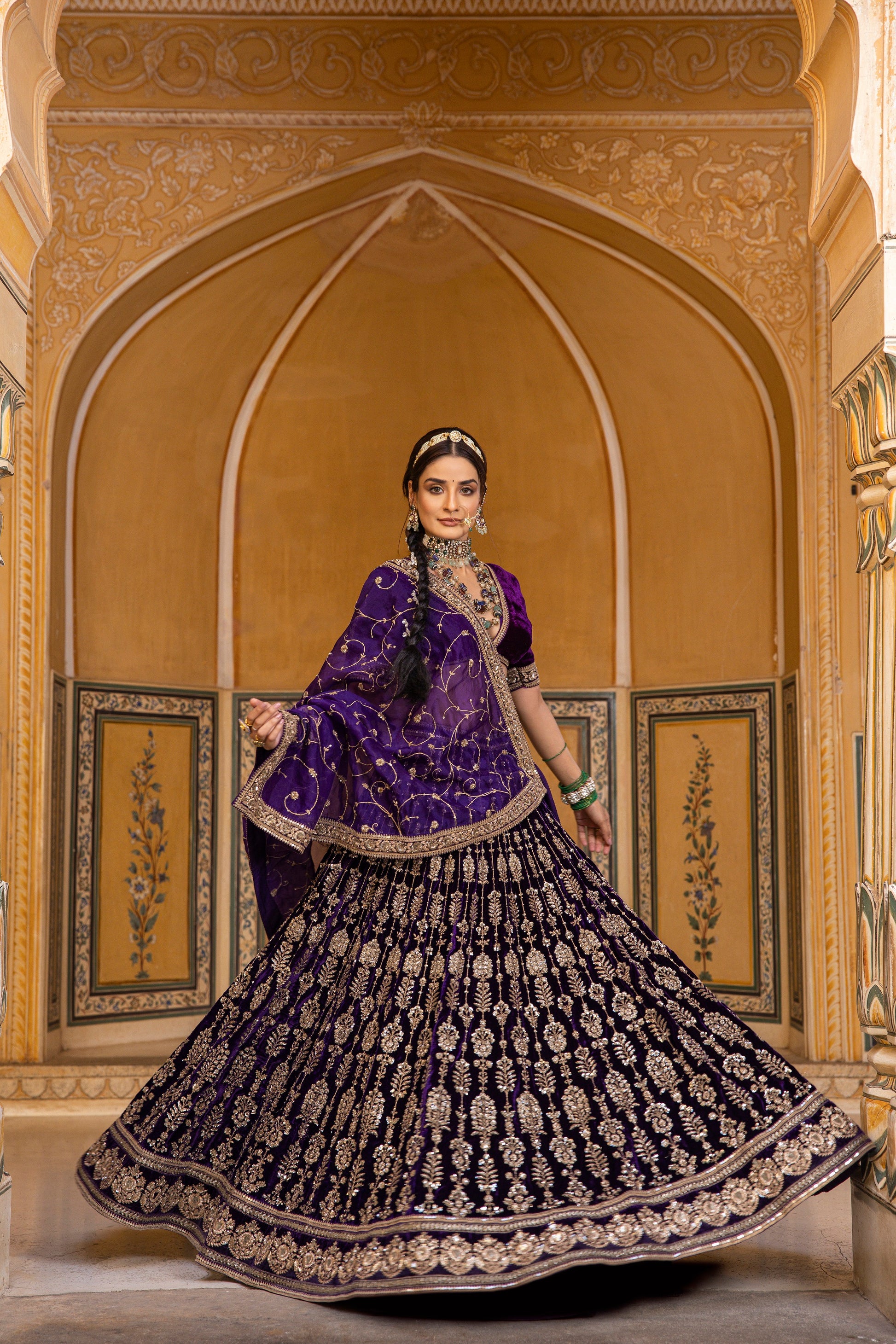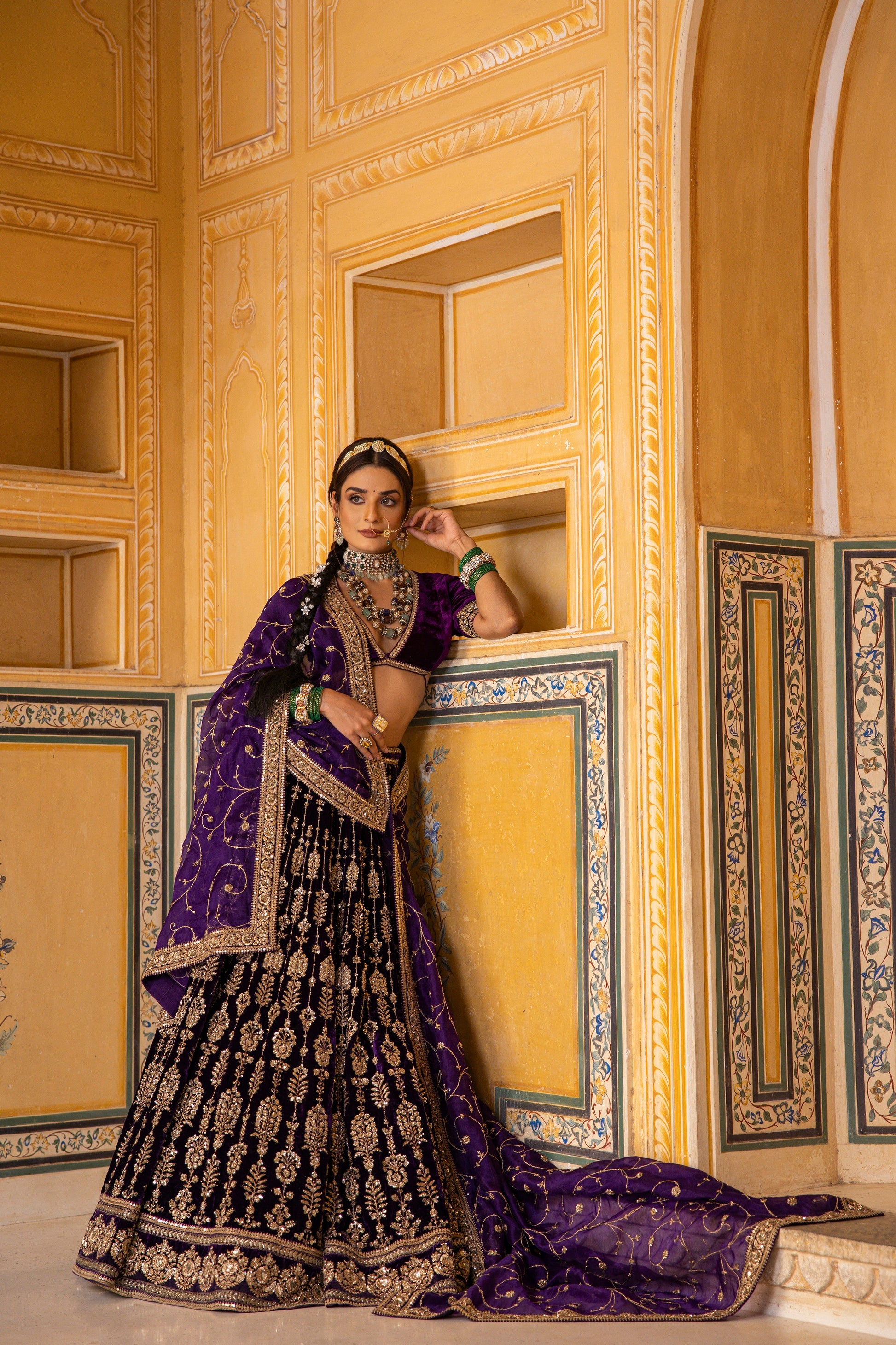 - This is a dark purple velvet lehenga set that comes with a choli and dupatta.