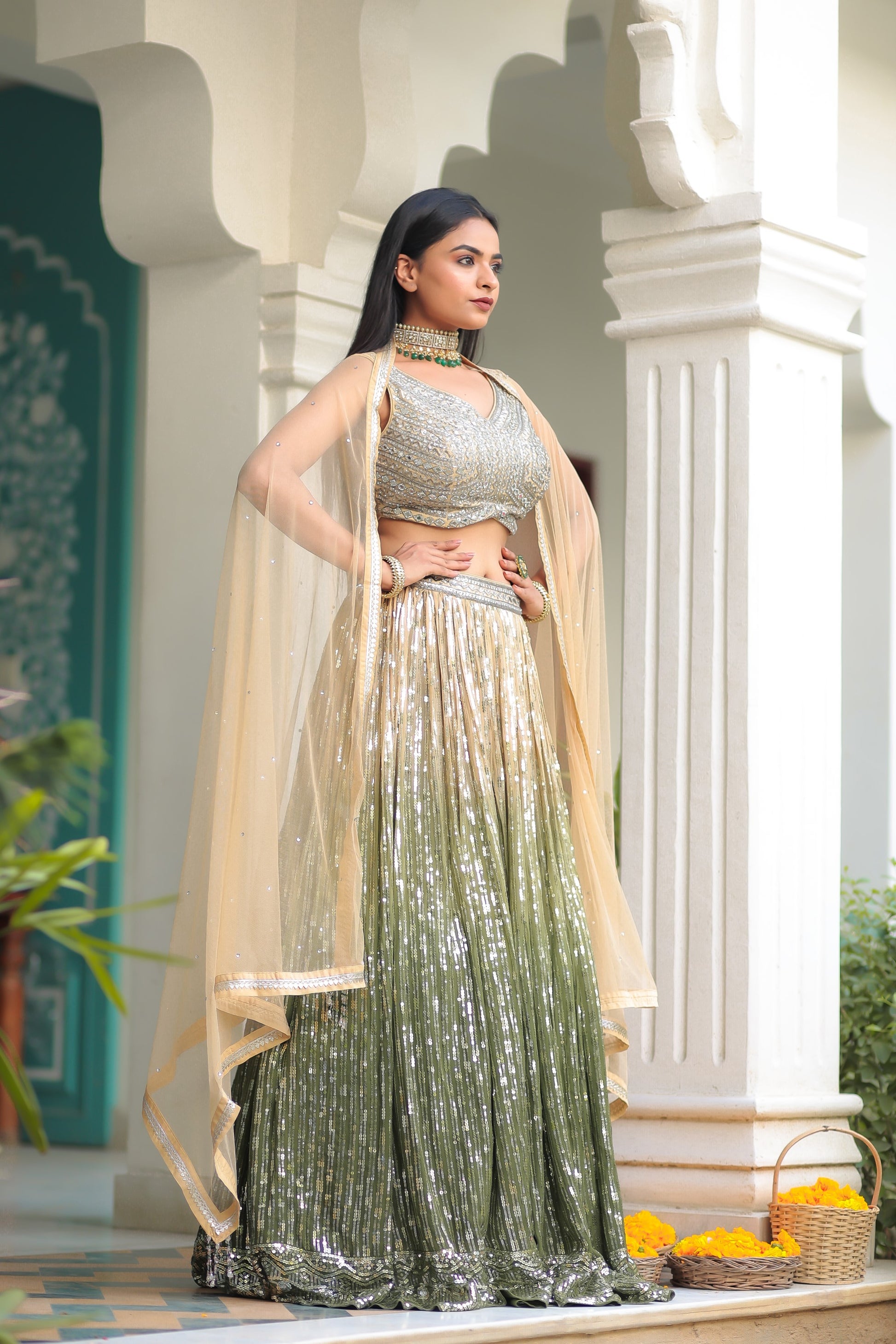- Beige And Green Shaded Georgette Skirt With Sequin Embellishment.