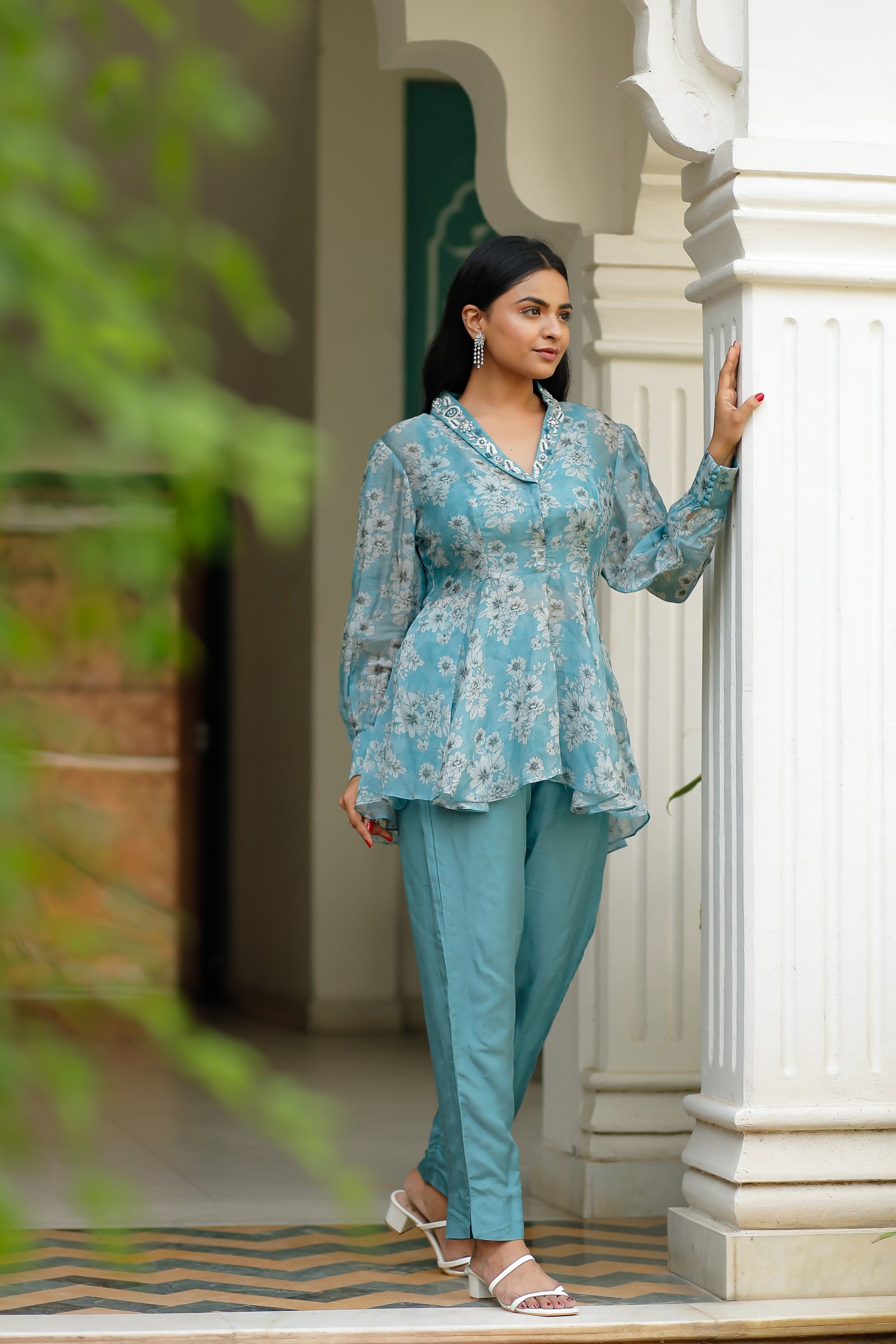- Dusty Blue Silk Organza Floral Printed Flared Peplum Top with Voluminous Lantern Sleeves With Cuffs.