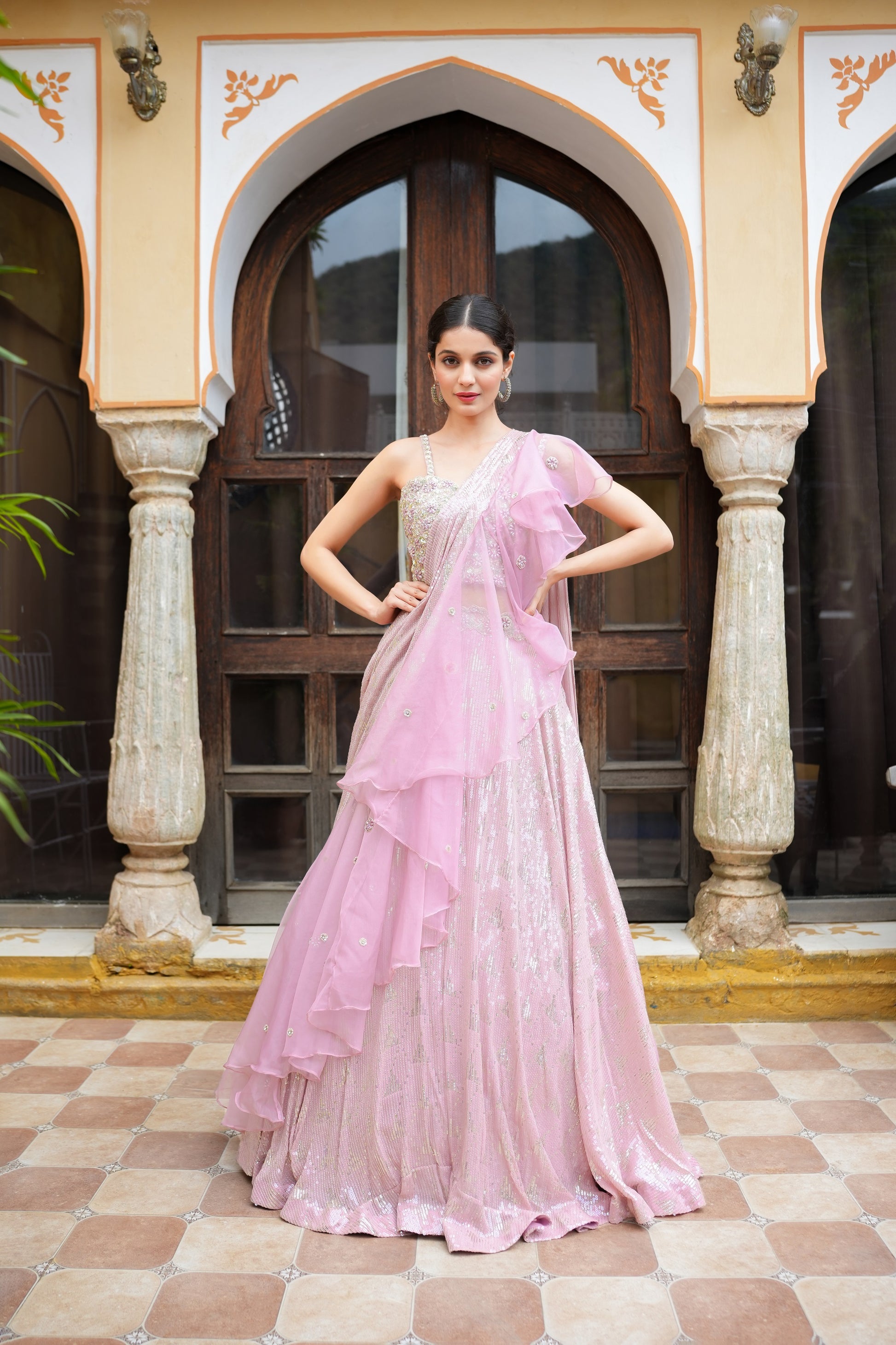 - This set features a stunning flamingo pink sequin work drape saree with a matching crop top.