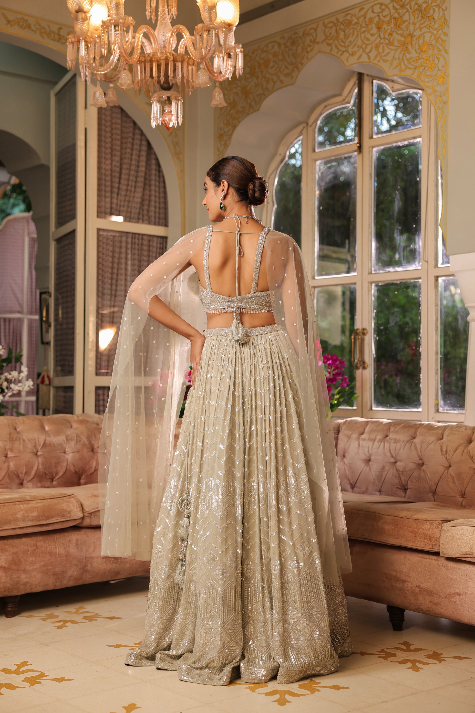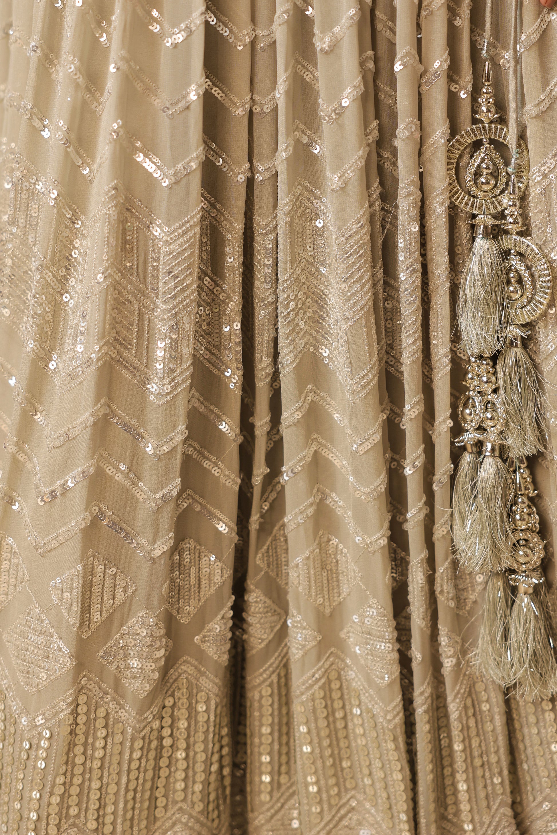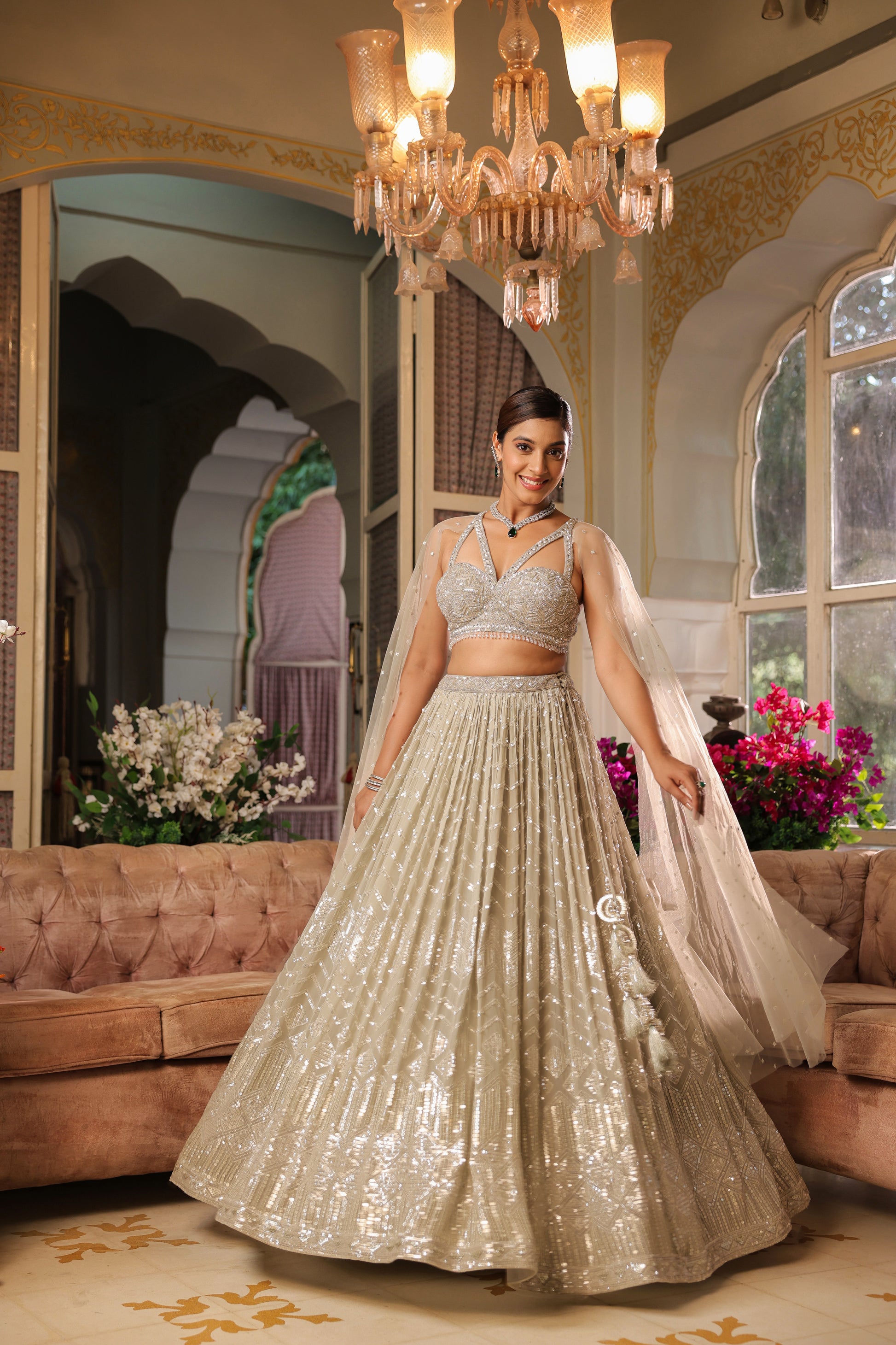 - The Blouse Is Paired With Georgette Gathered Skirt Having Sequin Work On It.
