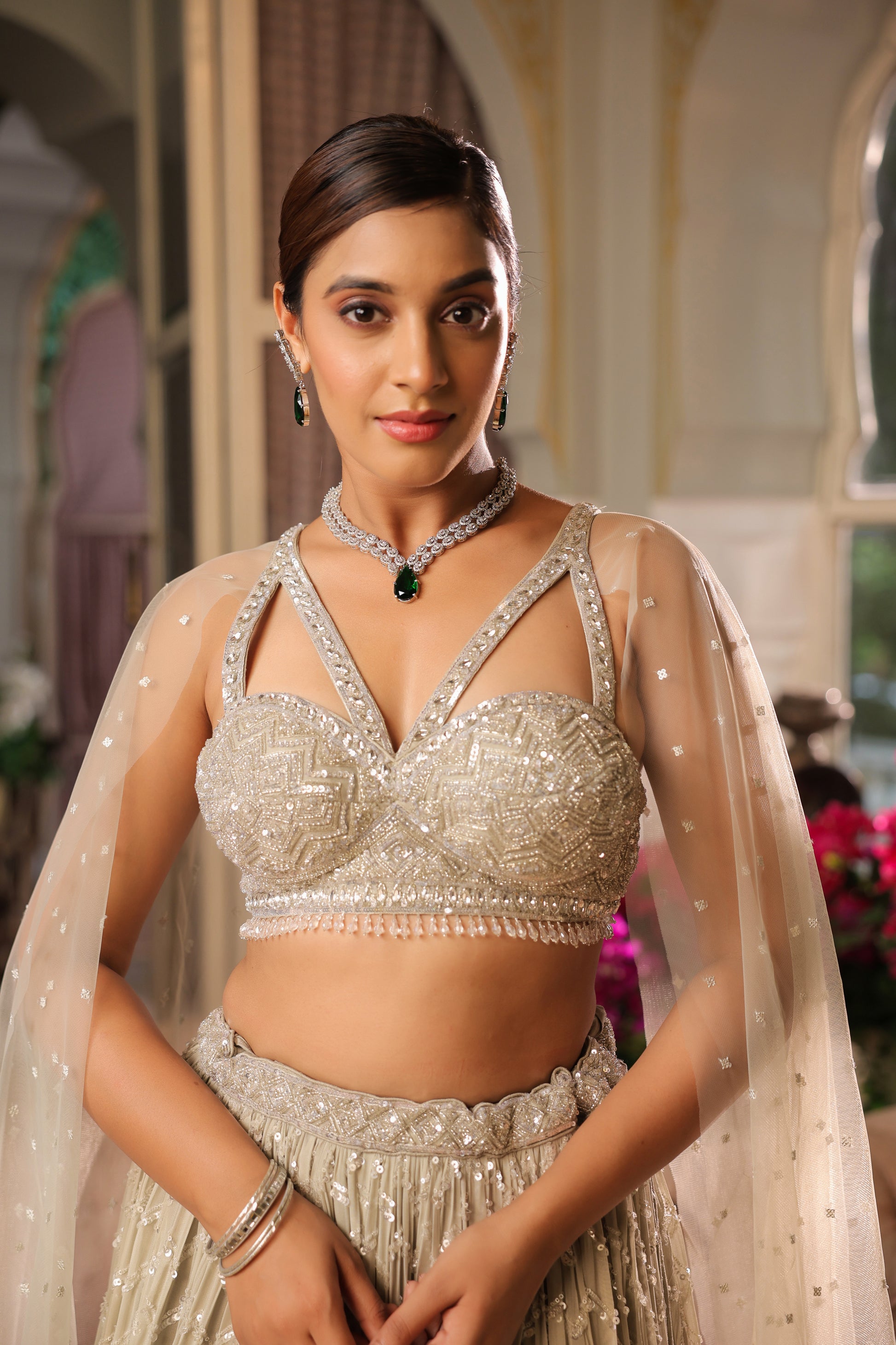 - The Choli Cut Blouse Is Fully Embellished With Geometric Motifs Of Sequin, Cut Dana, And Moti.