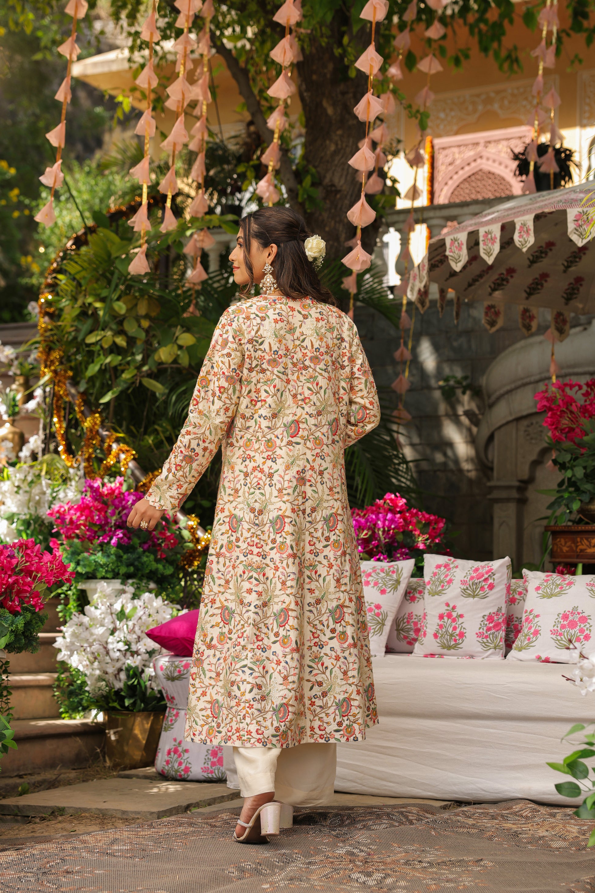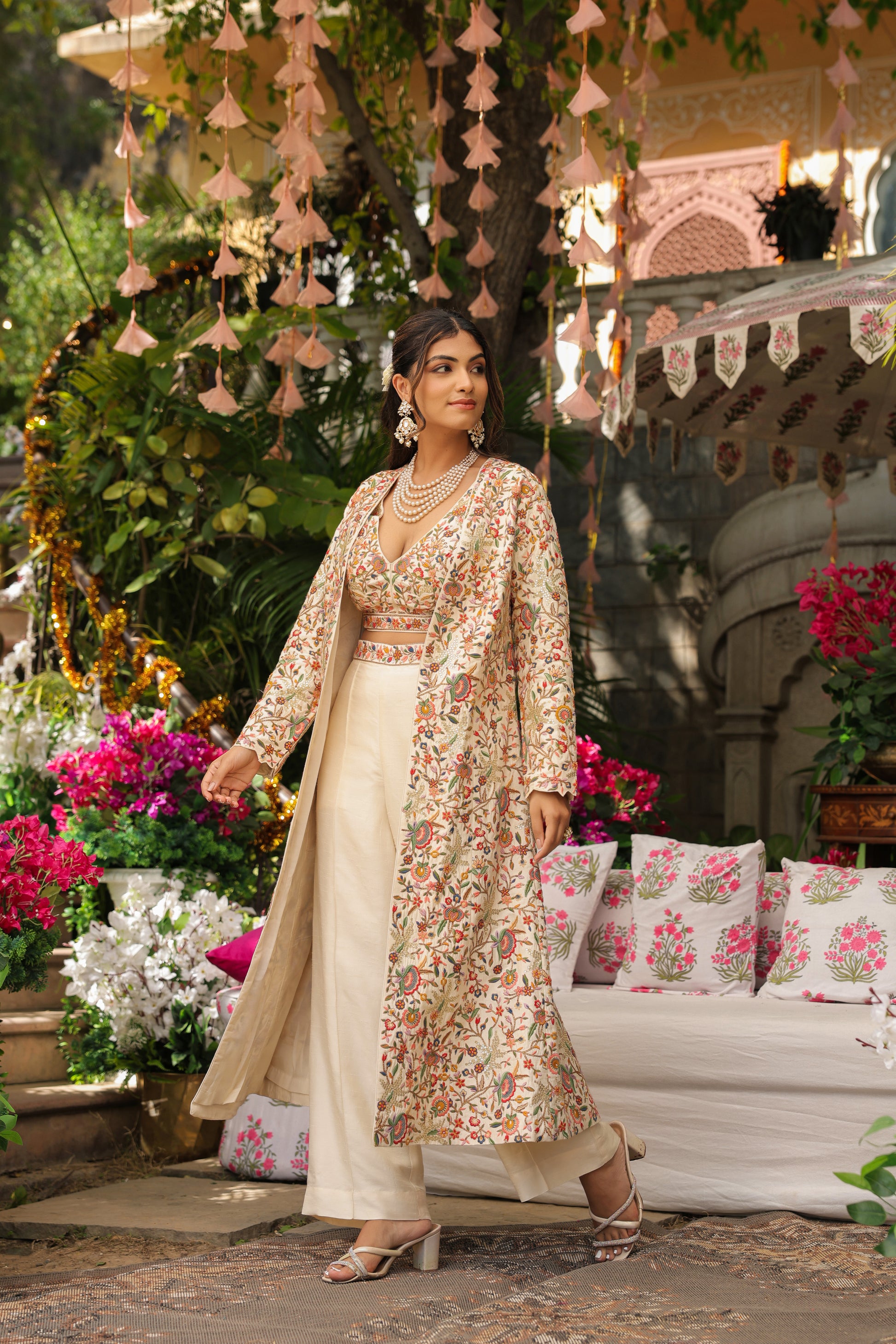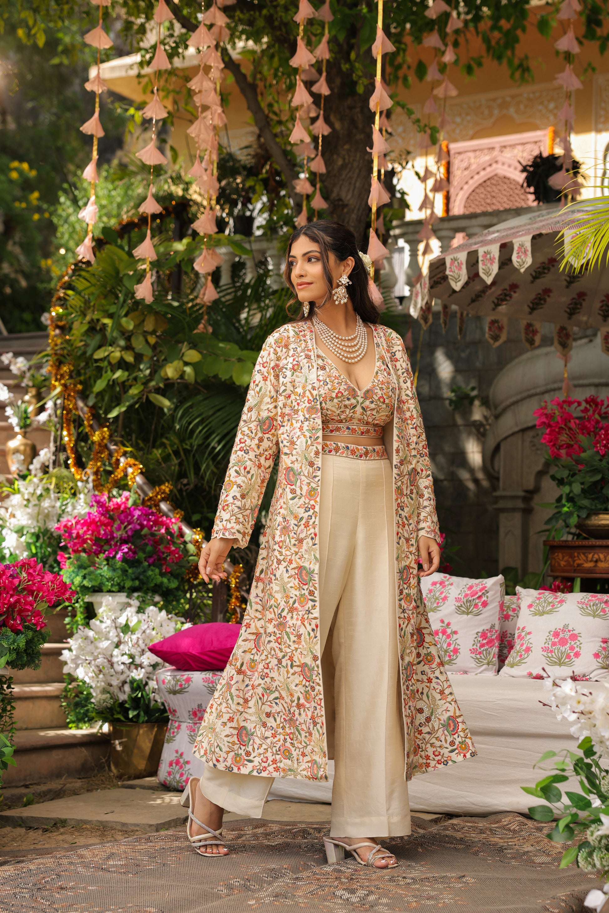 - The Set Is Topped With Front Open Full Sleeve Long Jacket.
