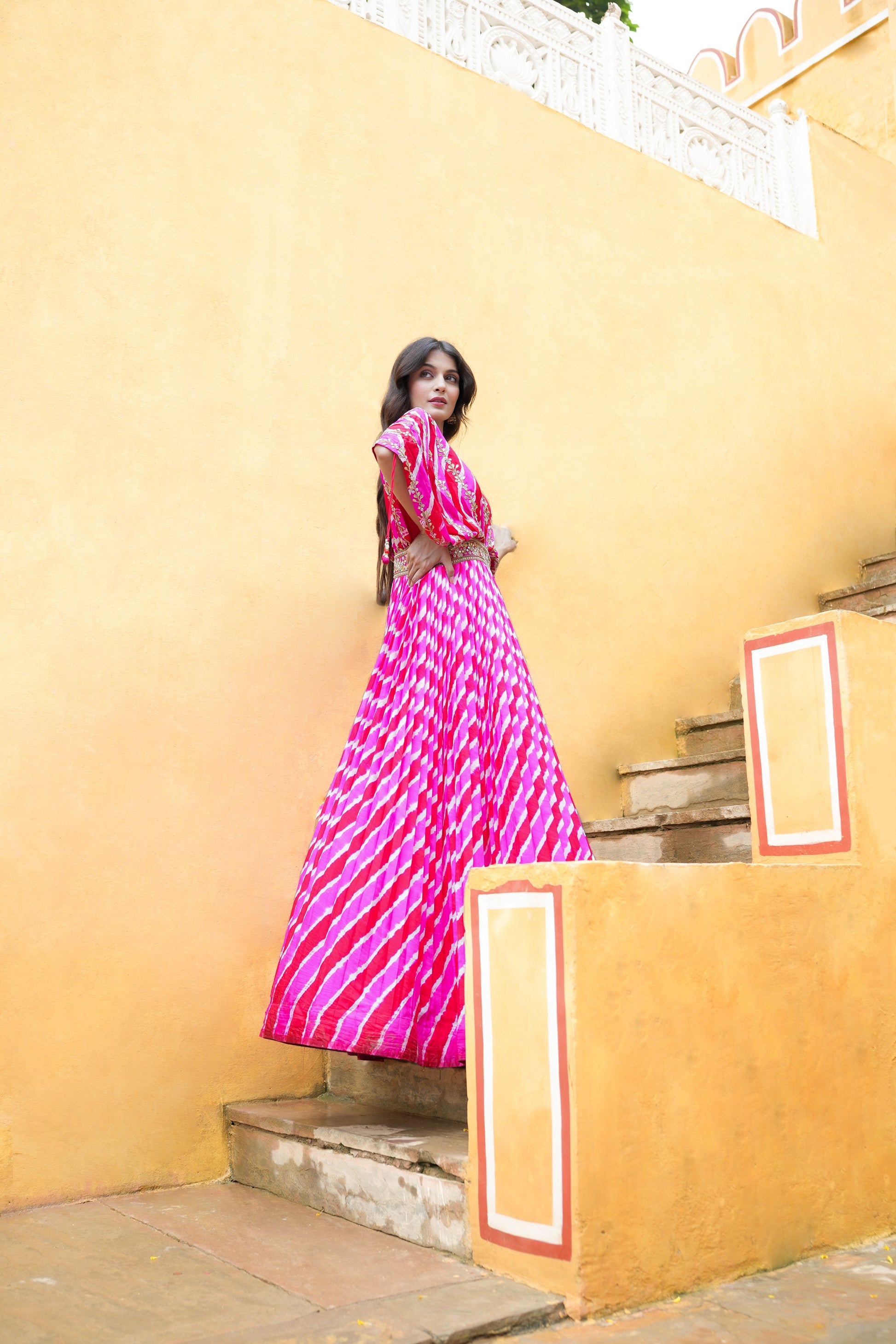 - This is a beautiful long lehariya gown in shades of pink and red, made of tesser silk.