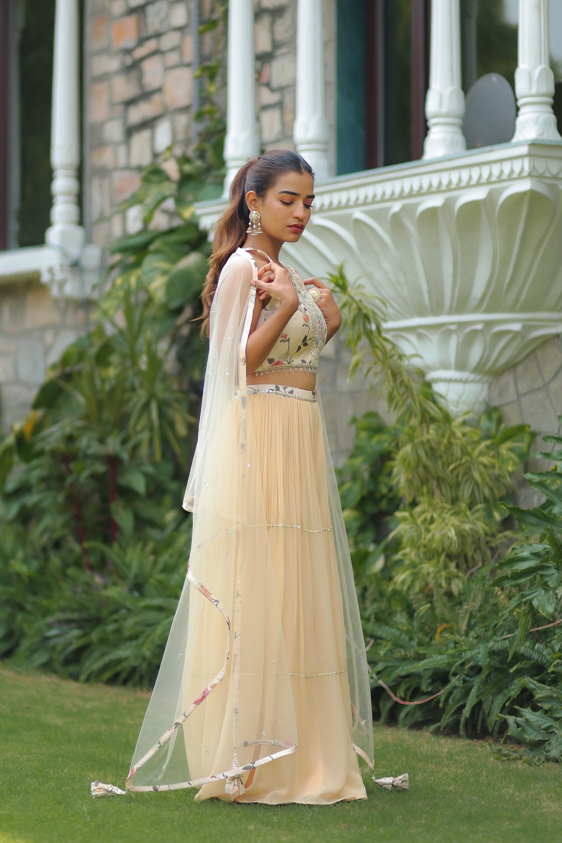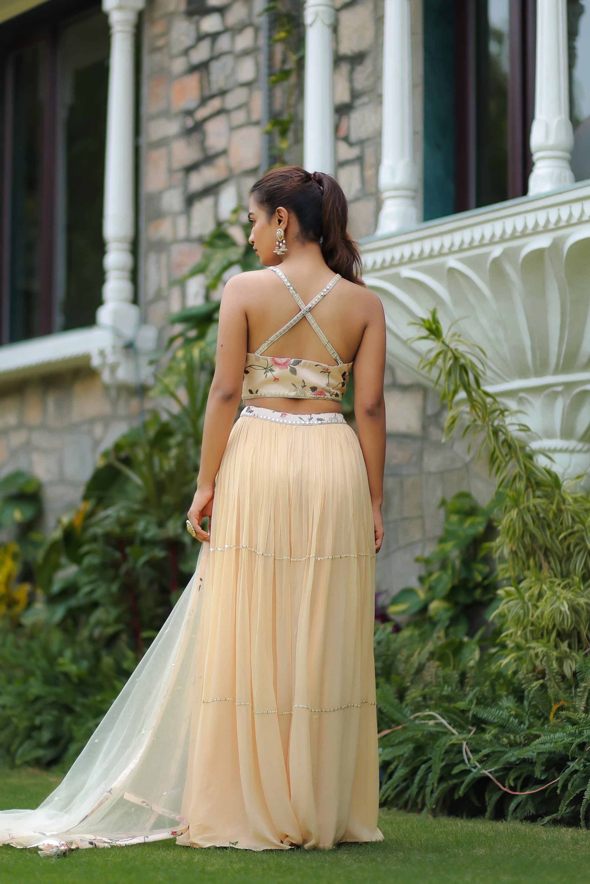 - Light Beige Coloured Halter Neck Padded Crop Top With Floral Digital Print Adorned With Tube, Resham, And Sequin Work On The Centre In Front.