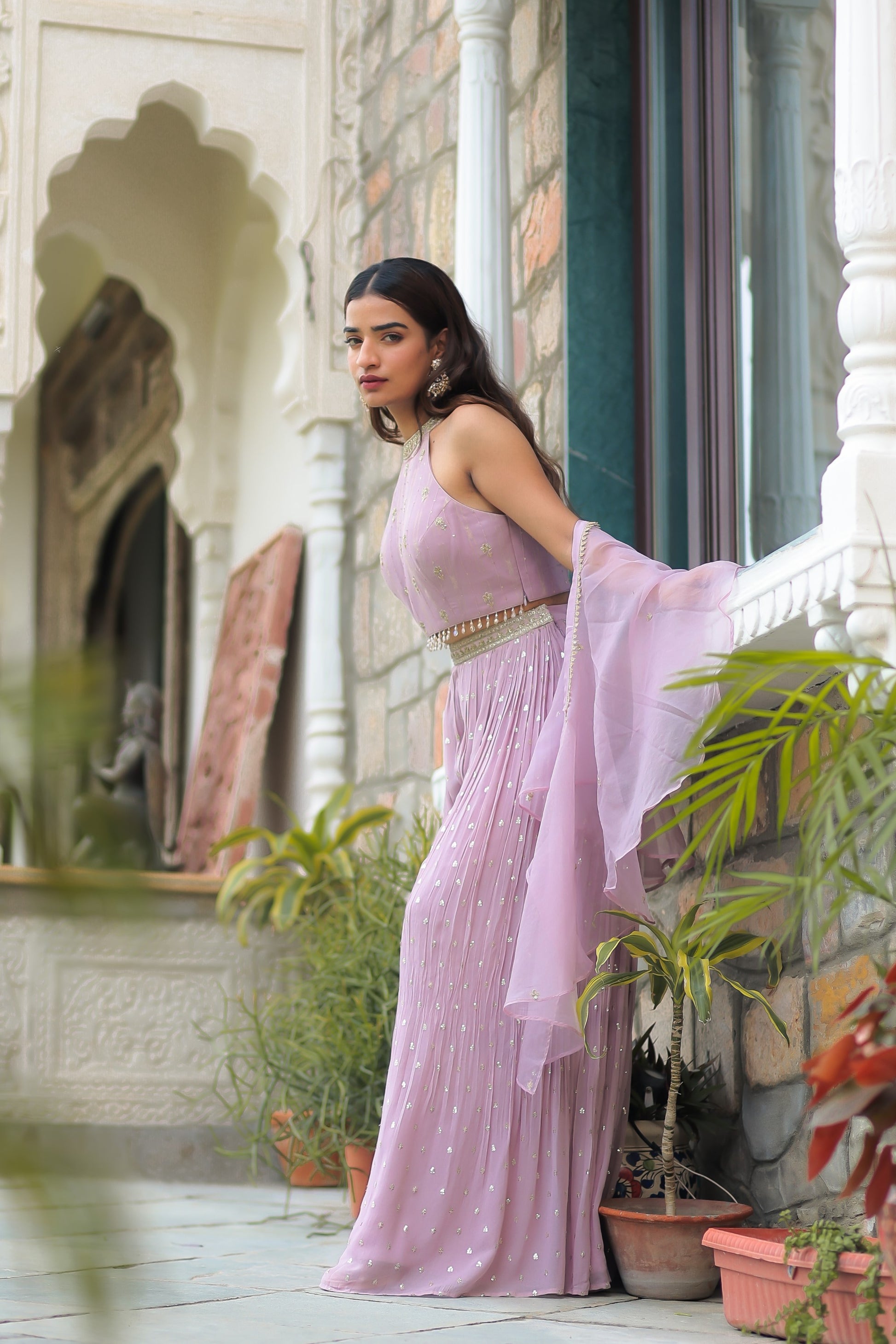 - Light Purple Zari Woven Georgette Halter Neck Crop Top Adorned With Tube And Dori Work All Over Having Moti Work On The Hem.