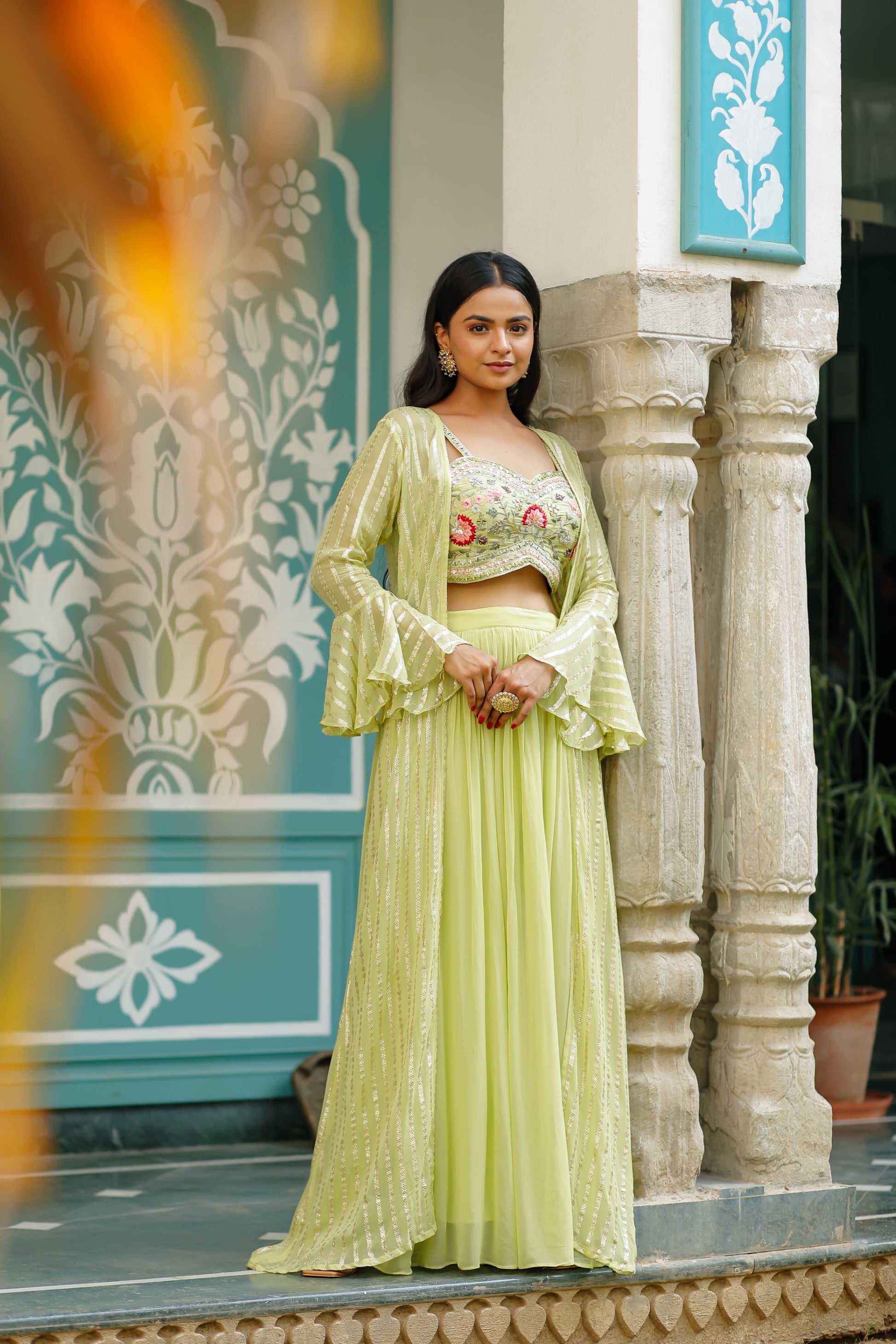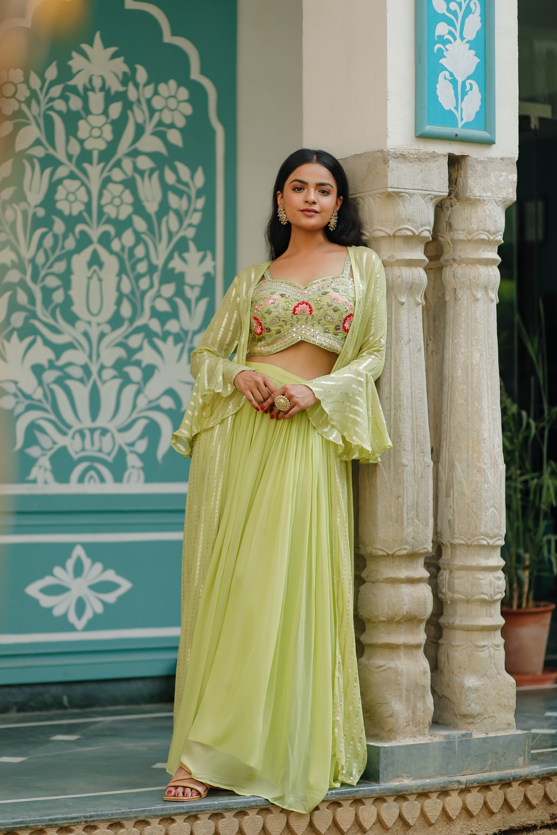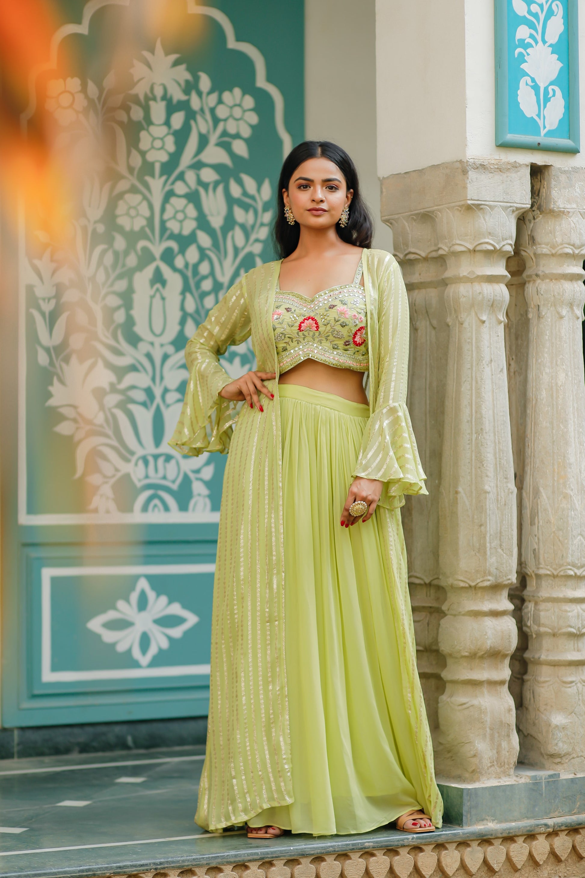 - Lime Green Georgette Crop Top Set With Jacket.