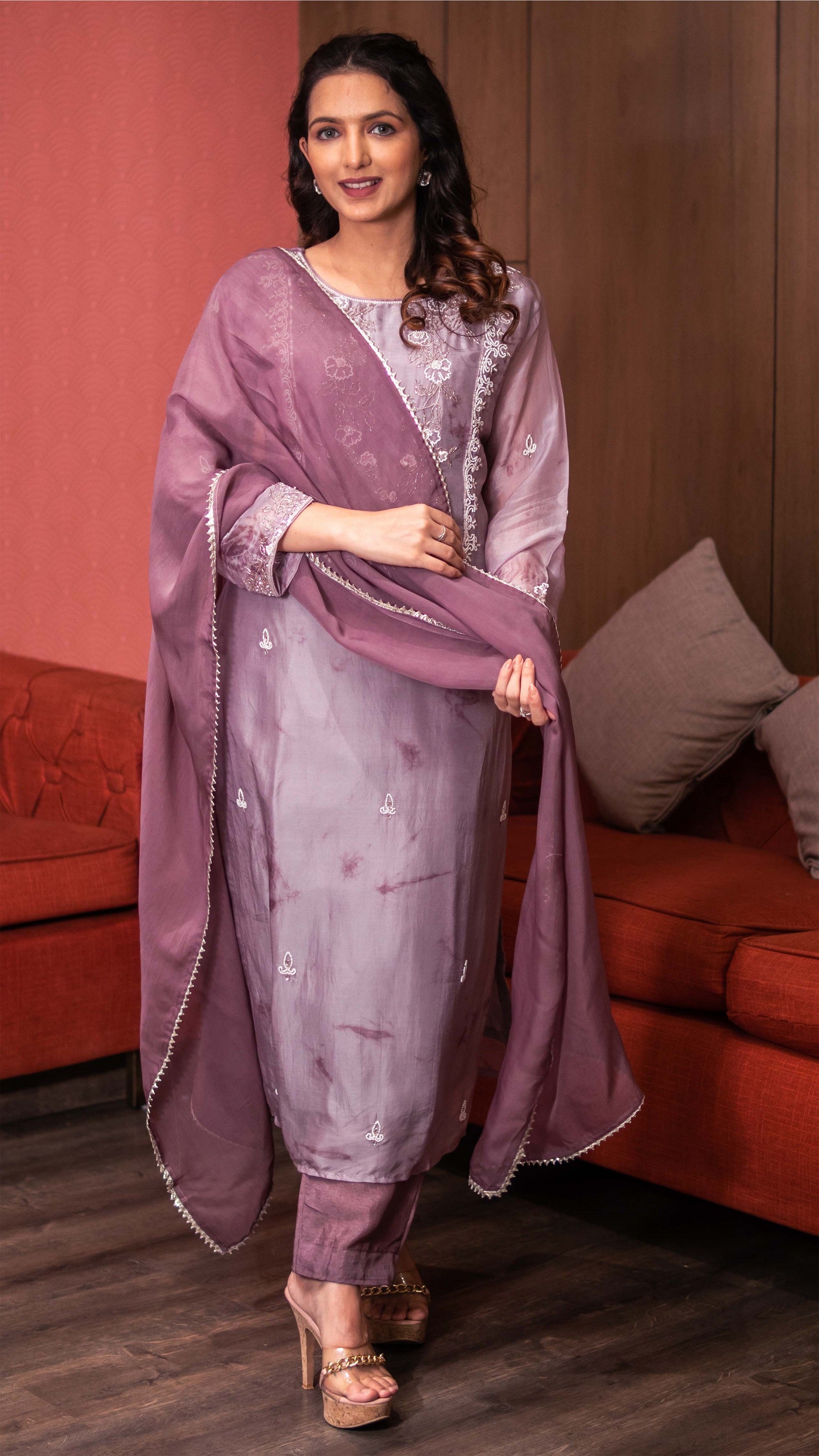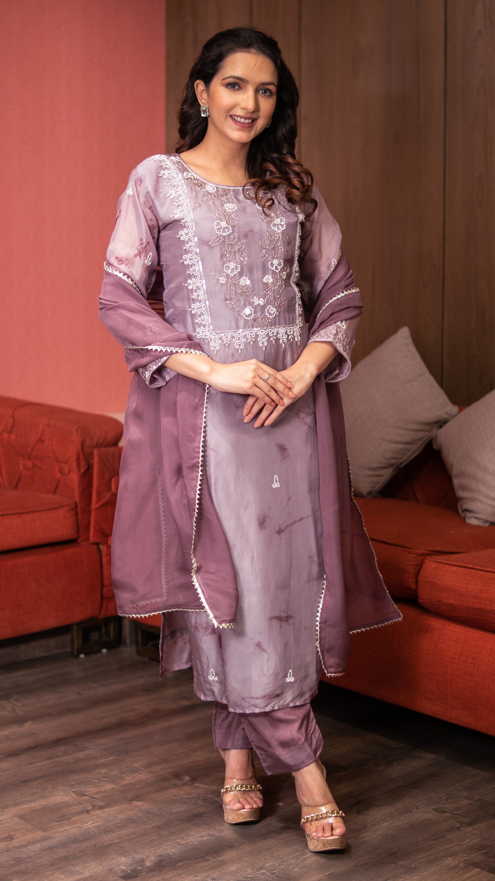 - The Glass Organza Kurta Has a Texture Of Tye Dye On It With a Yoke Made Of Moti, Sequin, And Cut Dana Work.