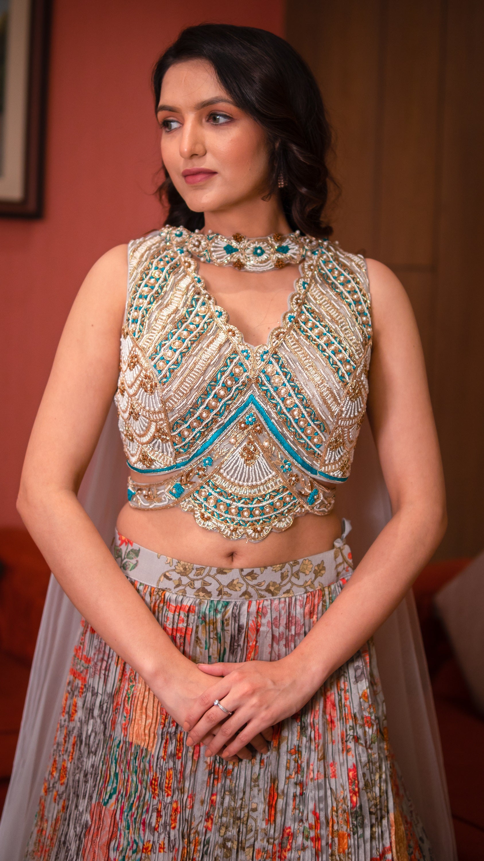 - Metal Gray Printed Chinnon Skirt With Embellished Crop Top And Stylized Dupatta.