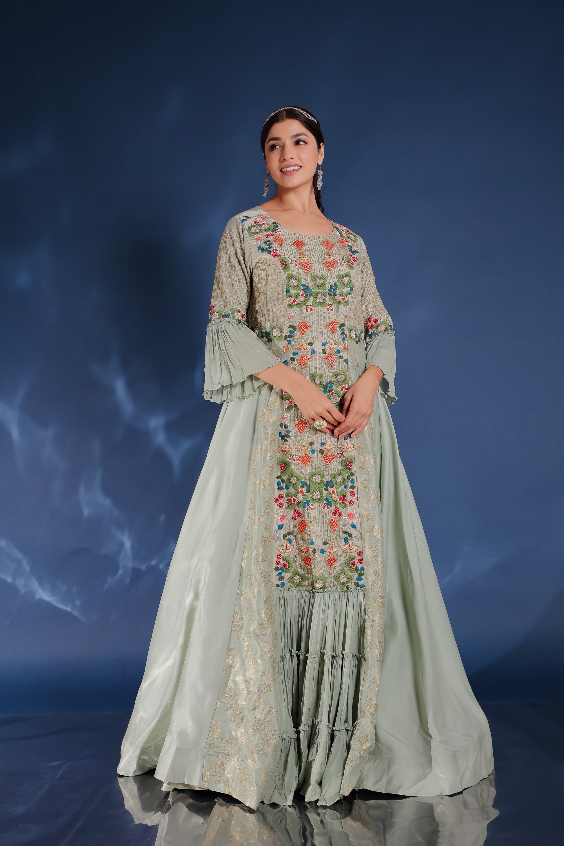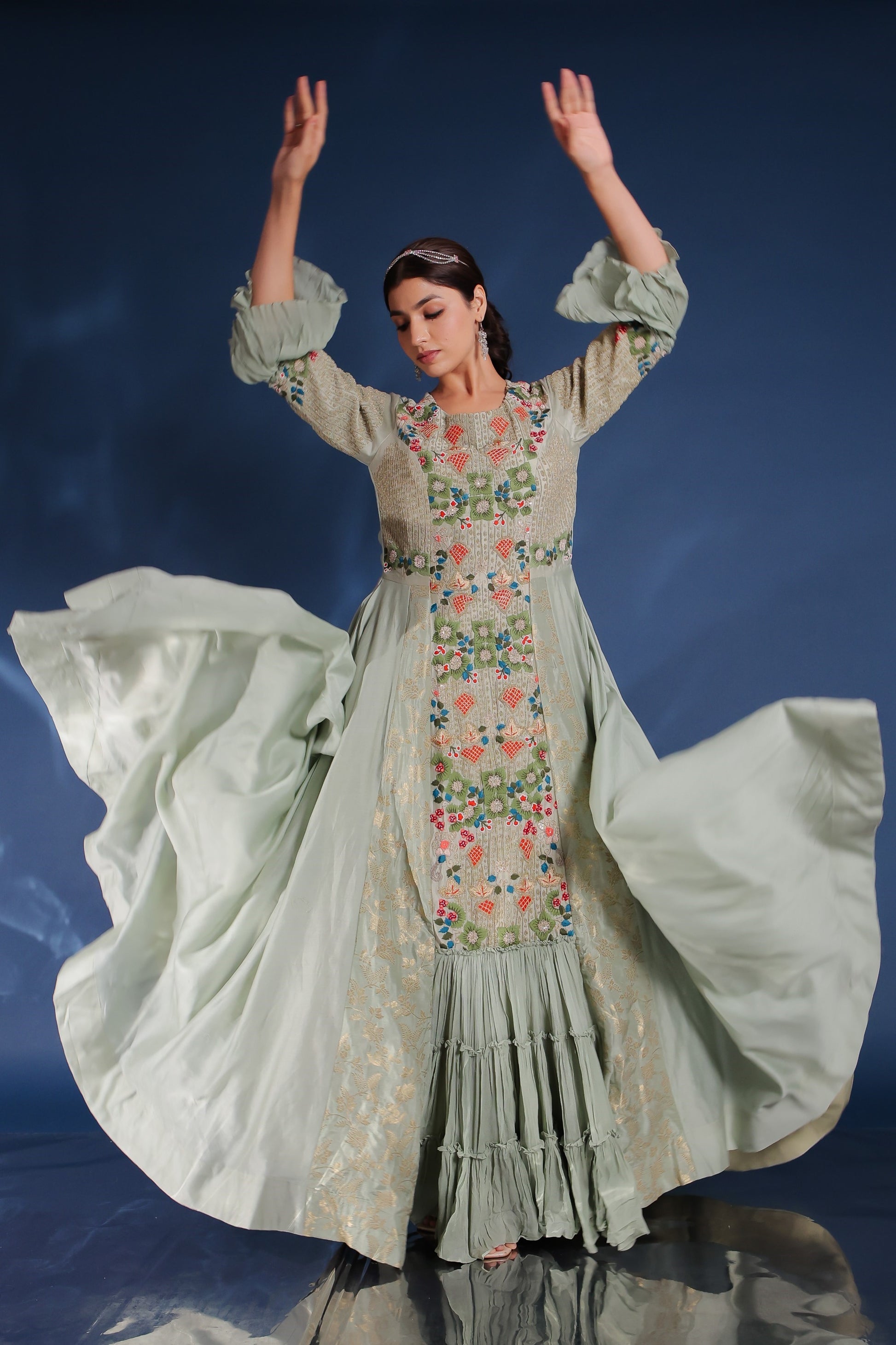 - Moss Green Blooming Print Flaired Long Anarkali Dress With Embellished Sleeve And Front Panel.