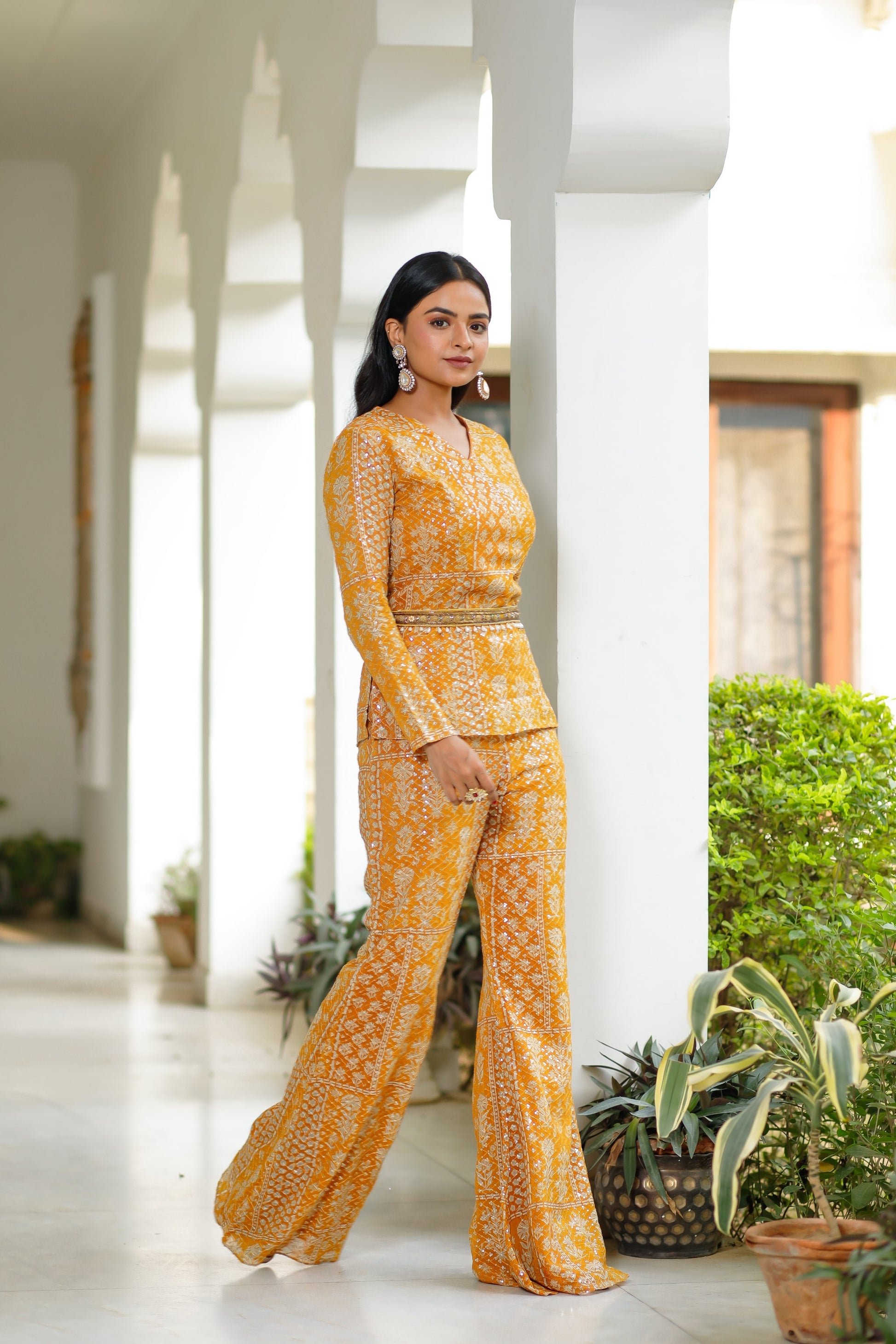 - Mustard Yellow Floral Printed Georgette Long Choli With Full-Sleeve Length And A Short Side Slit Finished With Sequin And Thread Embellishments.