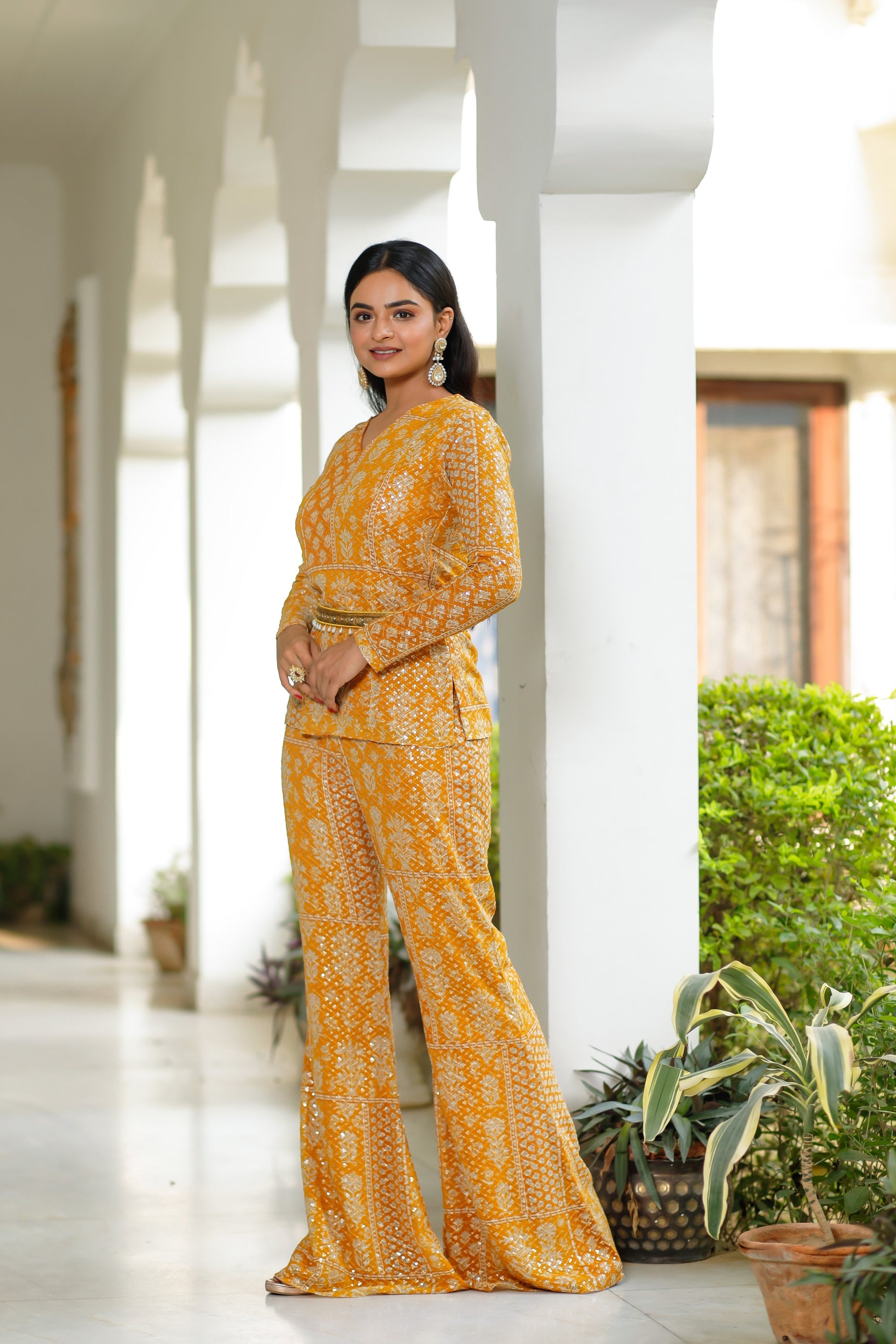- It is Paired with Long Westernised Bell Bottom Trousers in Similar Colour, Print, and Embellishment Work.