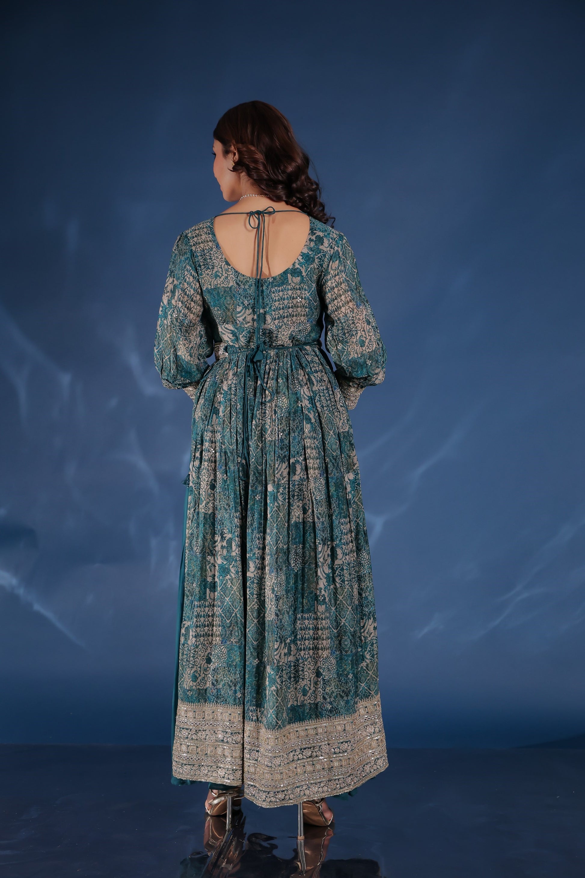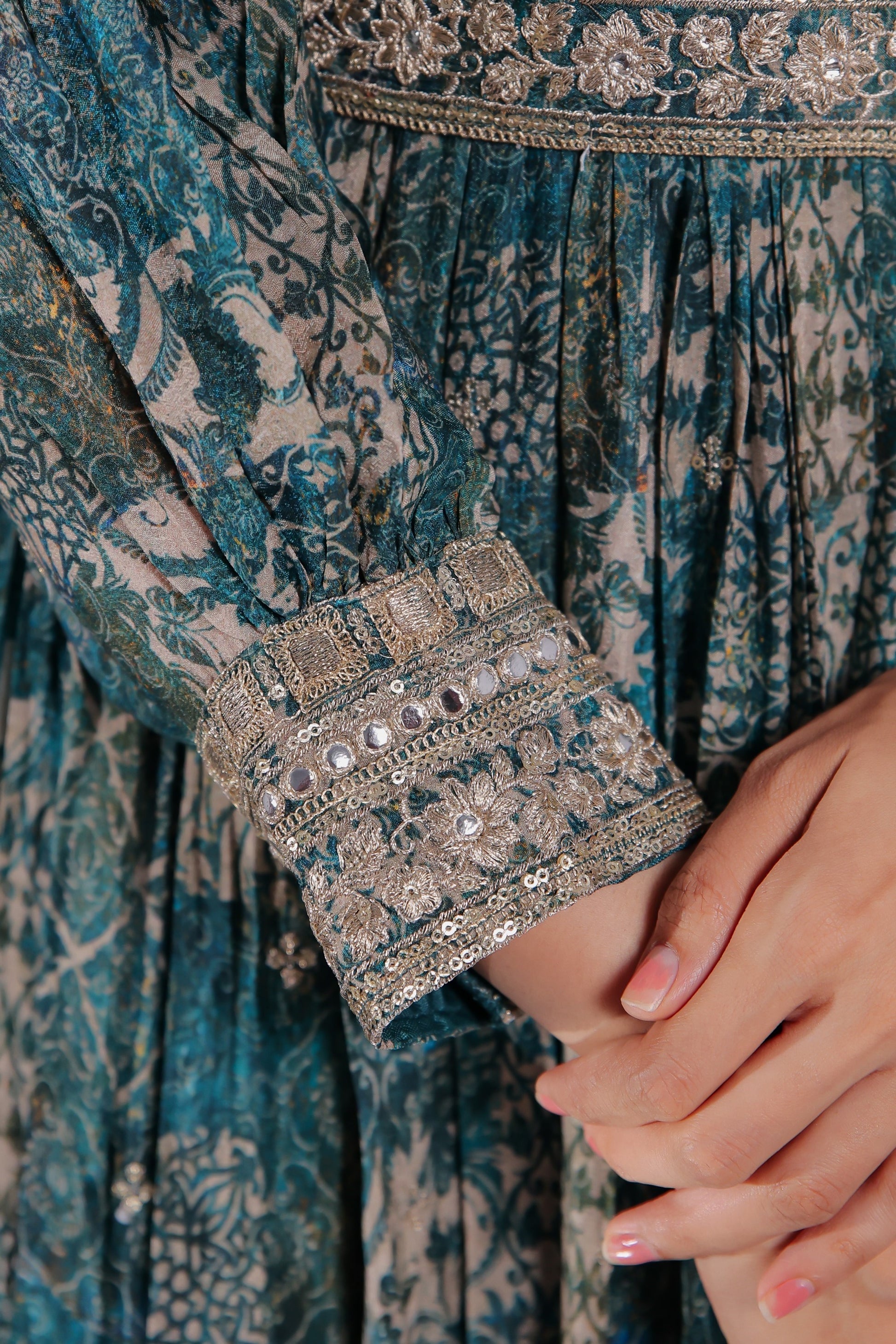 - Peacock Blue Georgette Zari Work Padded Side Slit Kurta Palazzo Set.