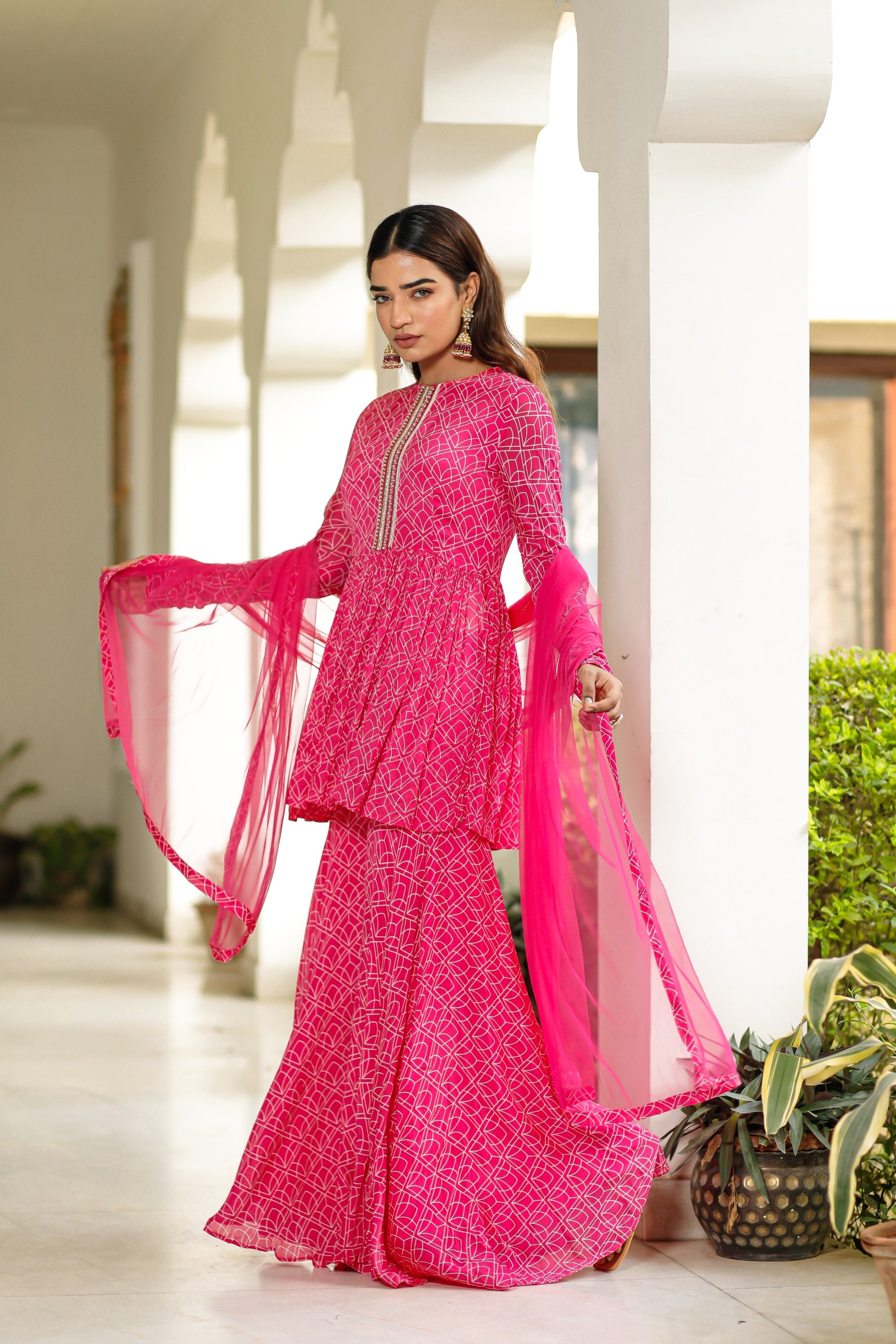 - Pink Digitally Printed Chinon Crepe Peplum Top with Moti and Bead Embellishment Work on The Front Placket With Flared Peplum.