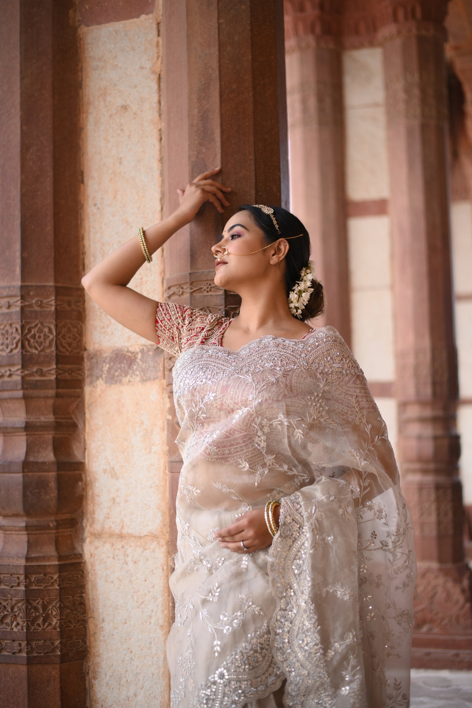 - The Saree Have Mugal Jaal Work All Over It With a Broad Border At The Edges.