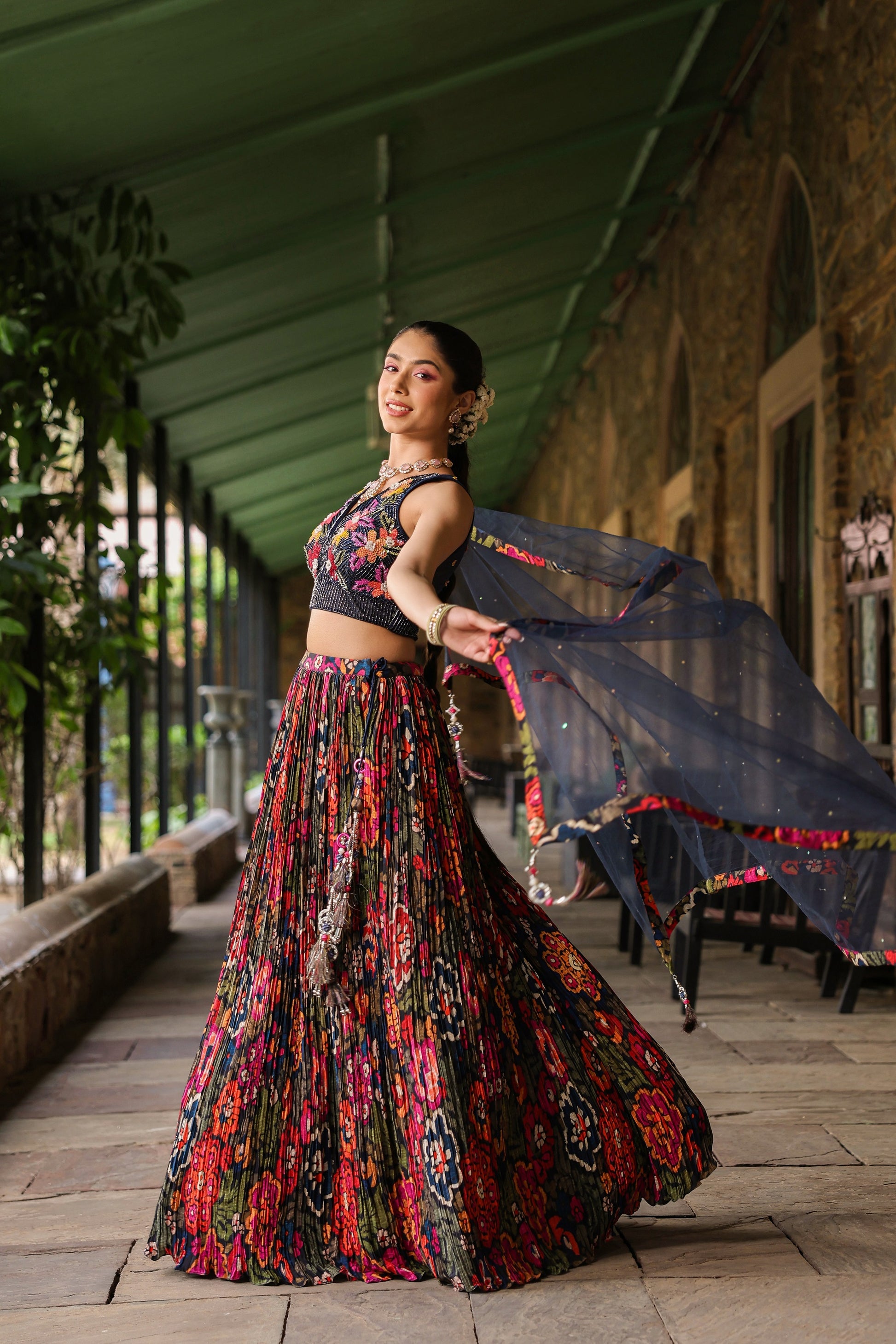 - The Prussian Blue V-Neck Choli Cut Crop Top Is Adorned With Multi-Colour Sequin Flowers And Cutdana Lines All Over It.