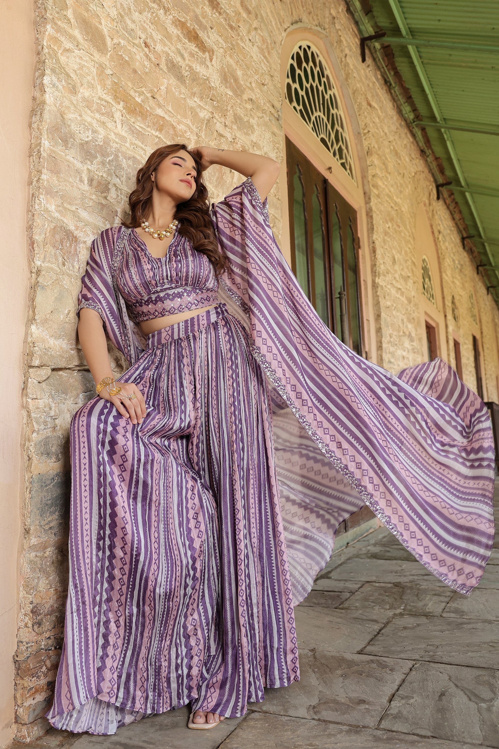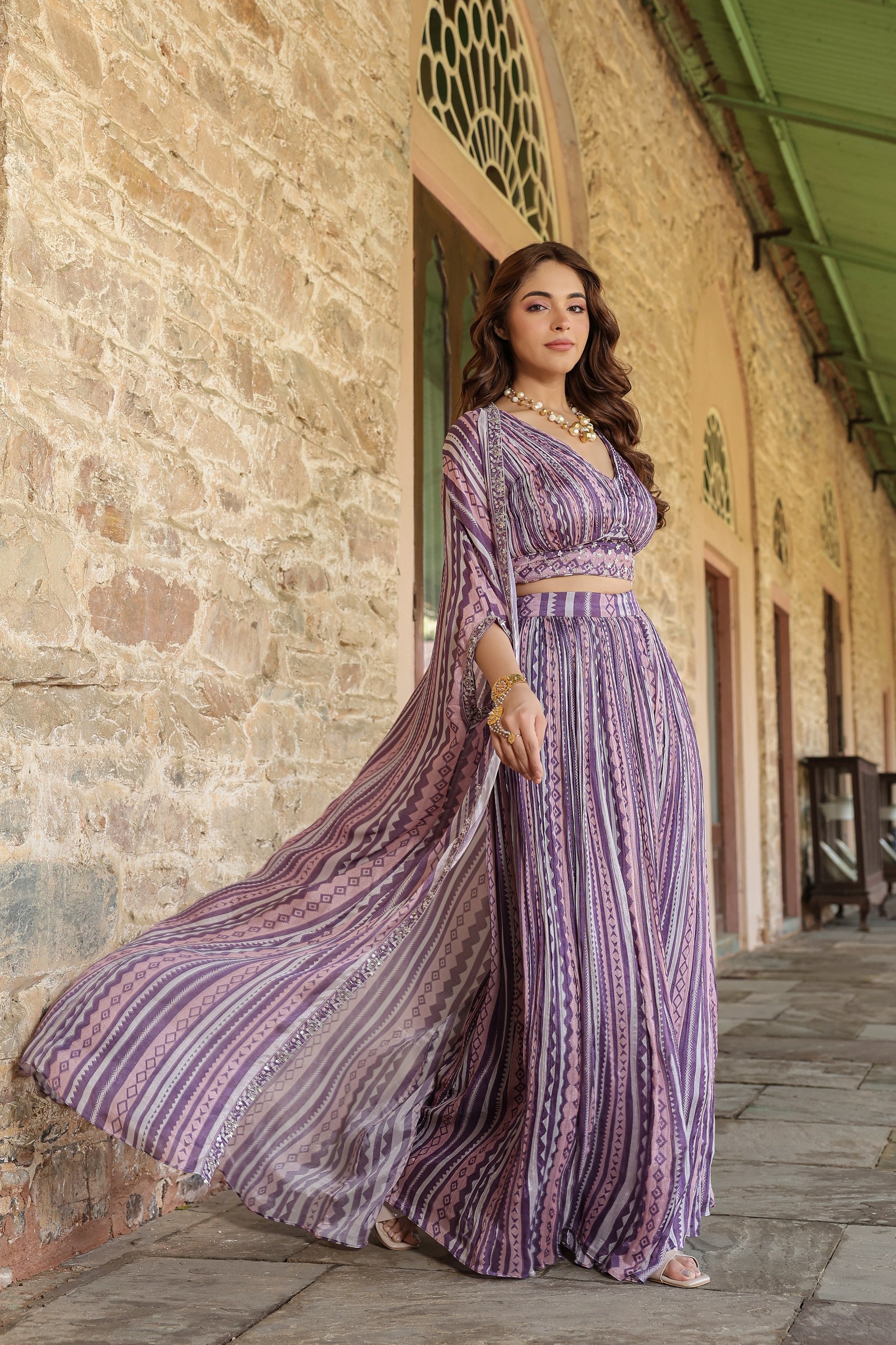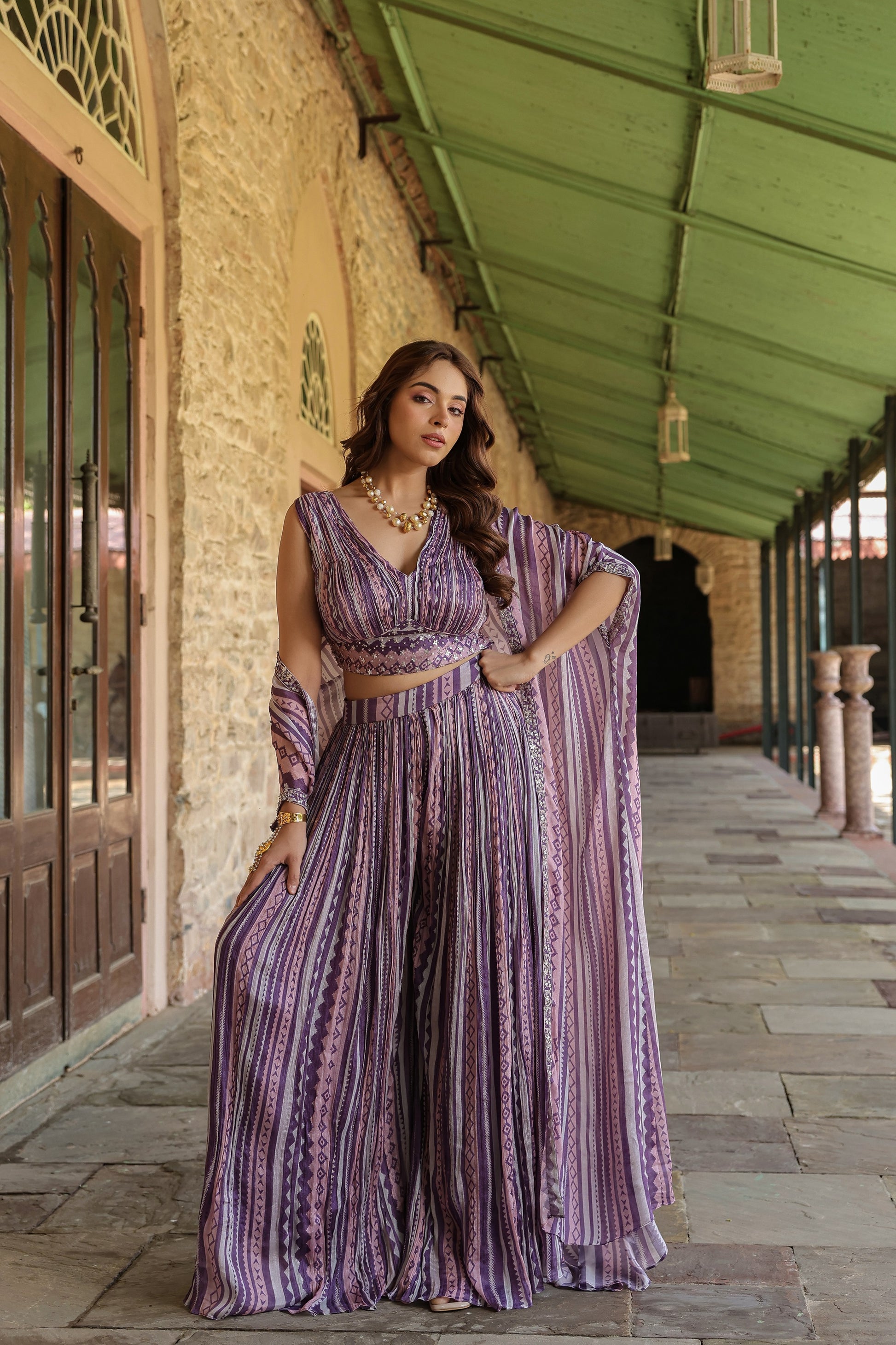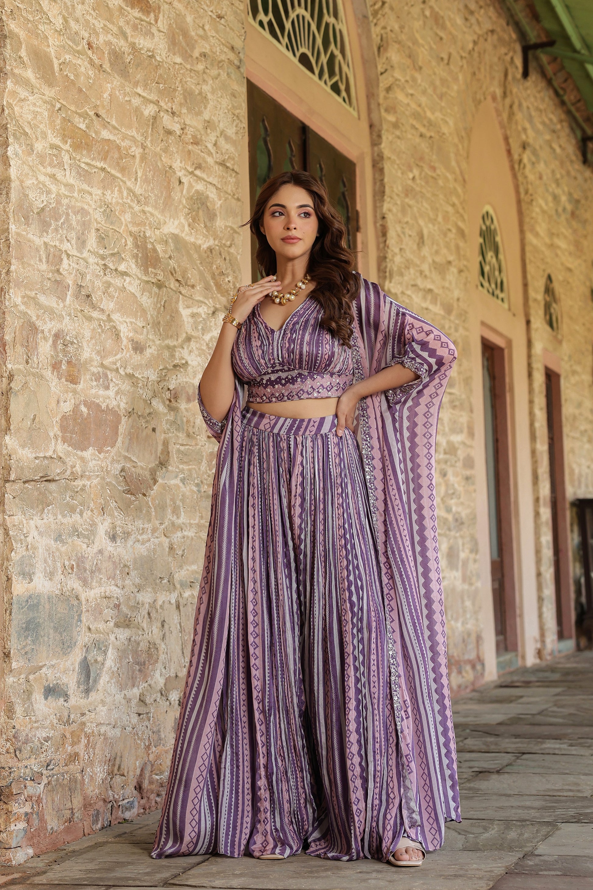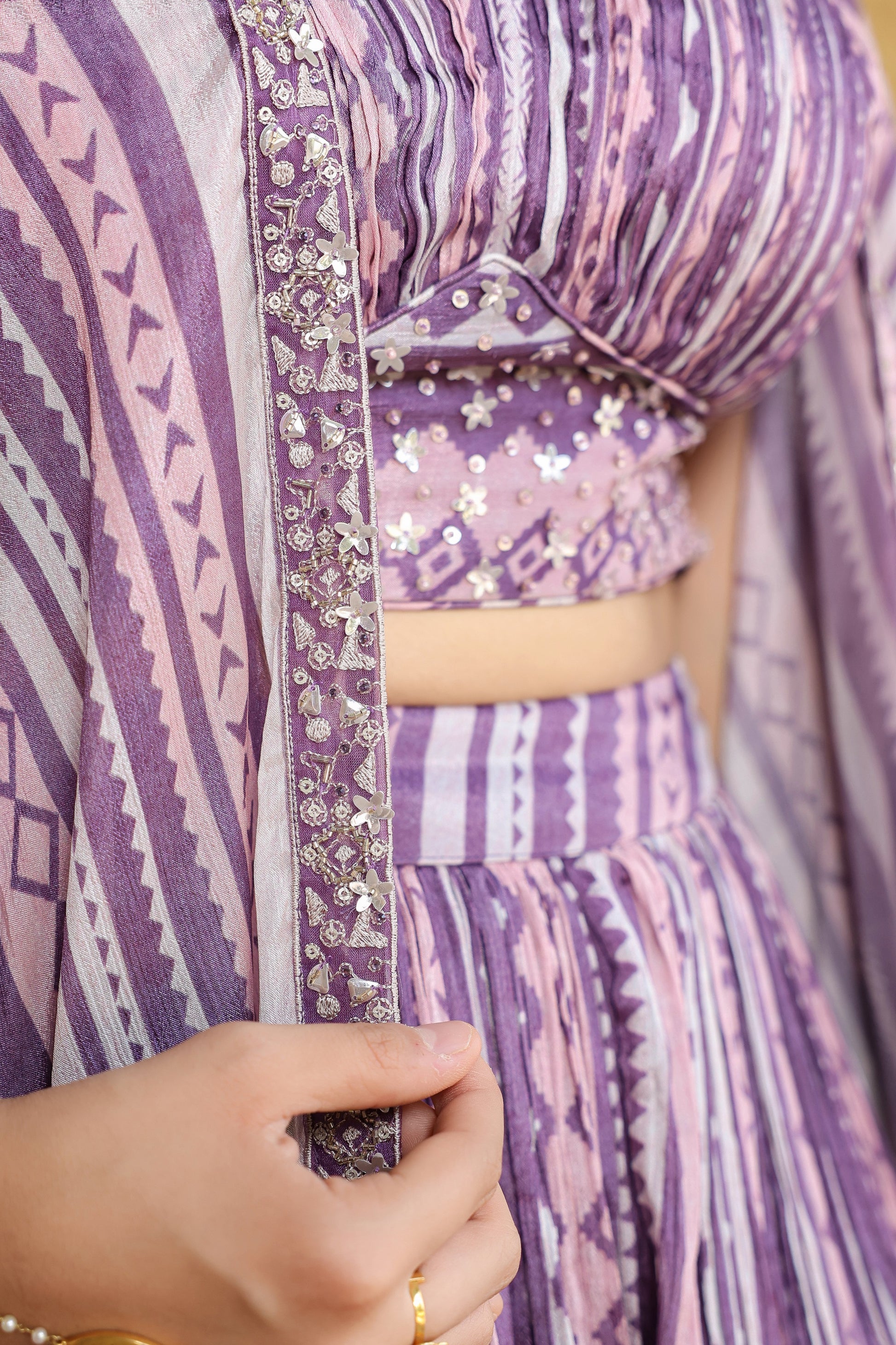 - Purple Shaded Geometric Print Crop Top Made Of Crush Crepe Silk.