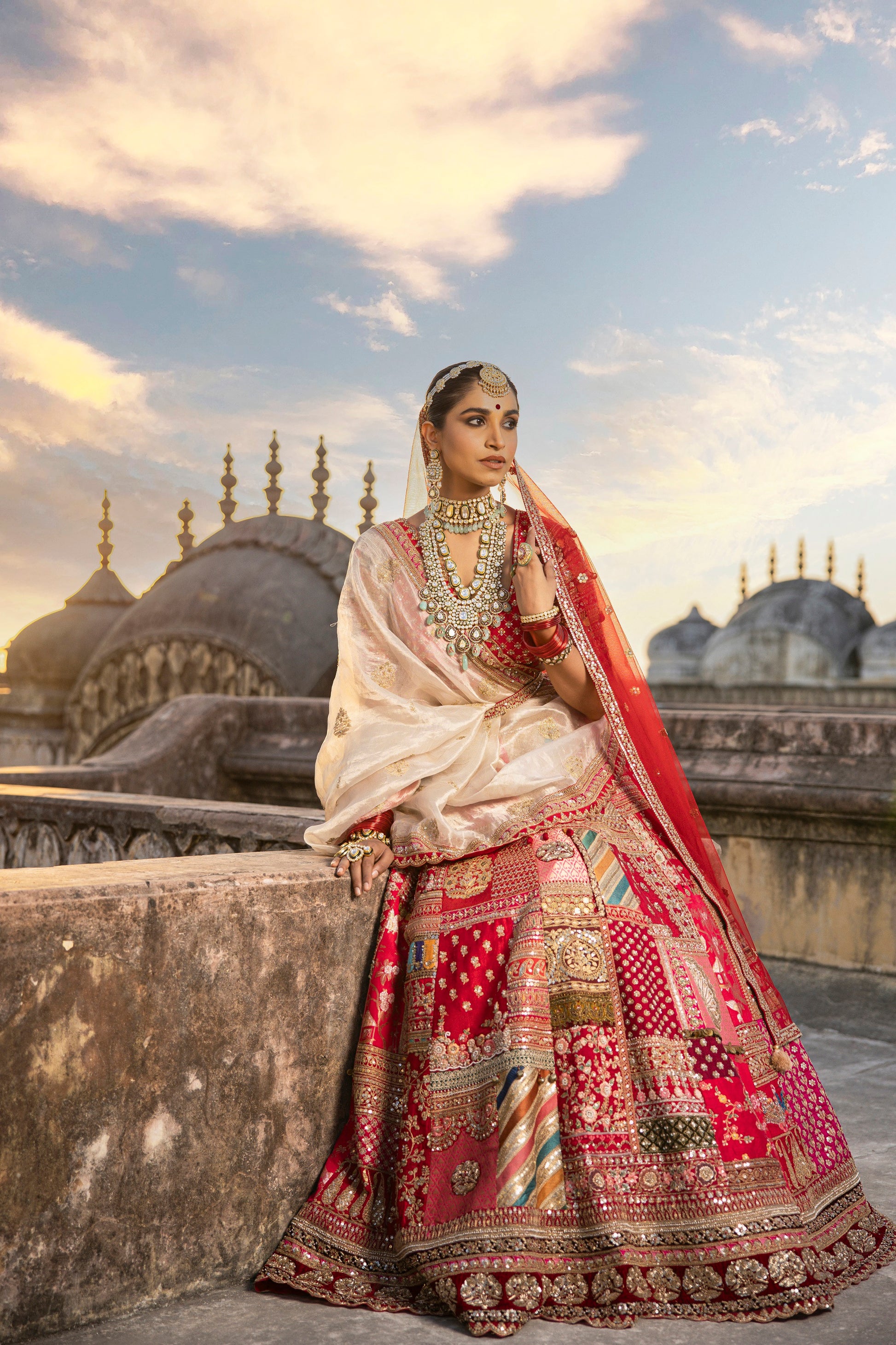 - Raw Silk Multi Patchwork Bridal lehenga With Choli And Dupatta.