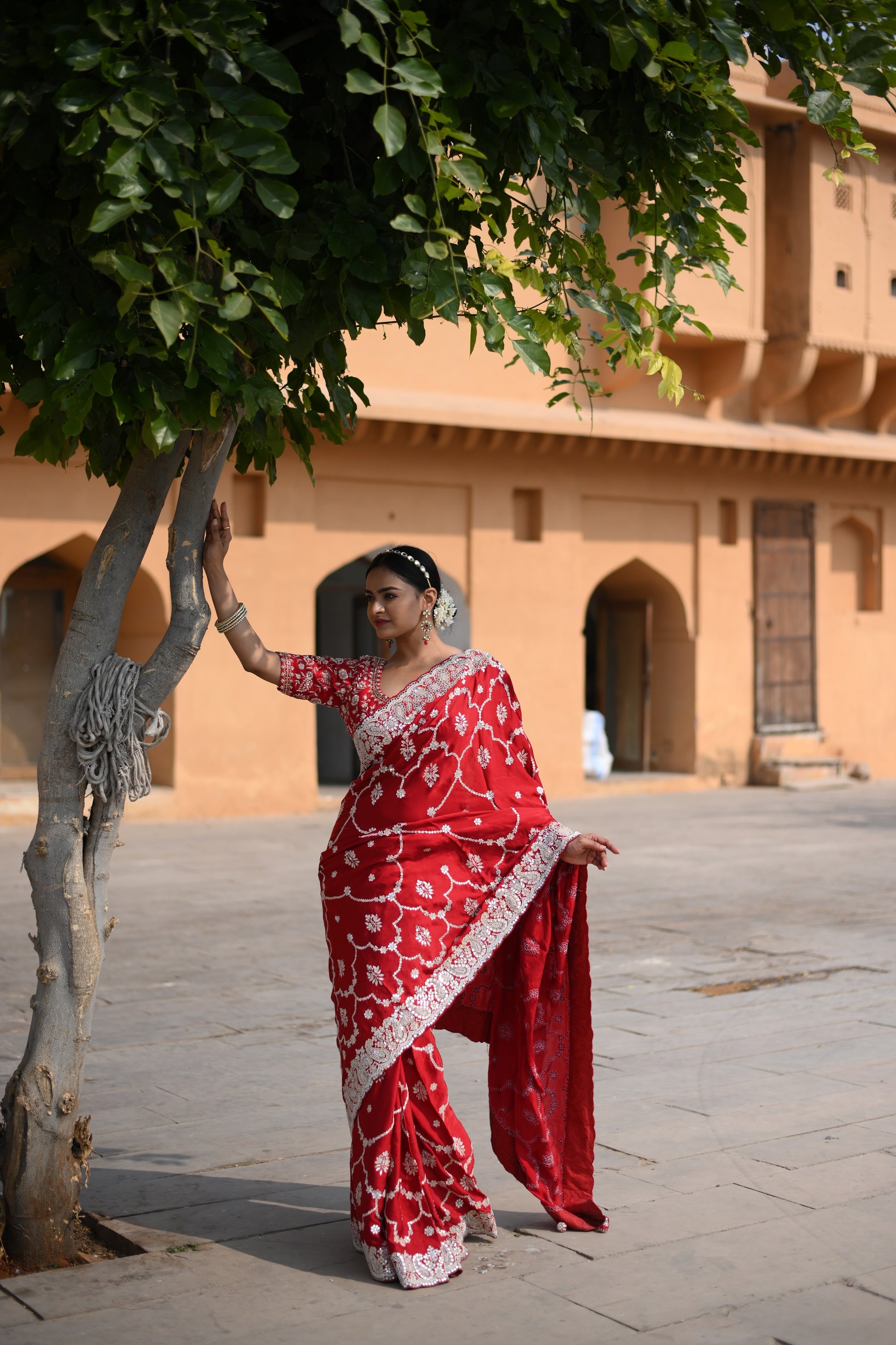 - Rose Red Crape Silk Saree Is Embellished With Gotta Patti, Zardozi, Stone, And Mirror.
