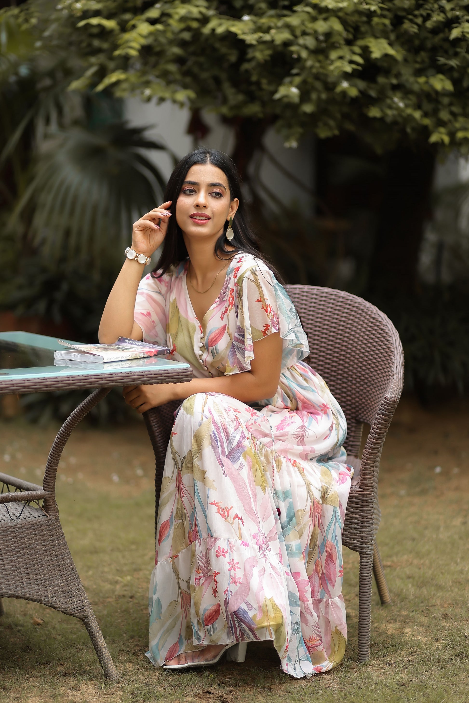 - Chiffon Salt White Multi Colour Floral Printed Dress Have V Neck.
