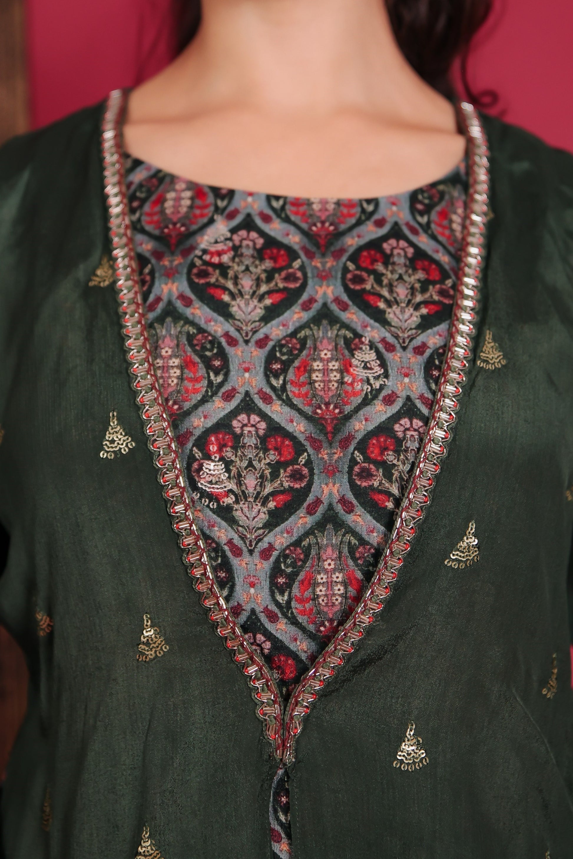 - Sap Green Chinnon Cut Sleeve Round Neck Traditional Printed A-Line Top With Sequin Buties All Over.