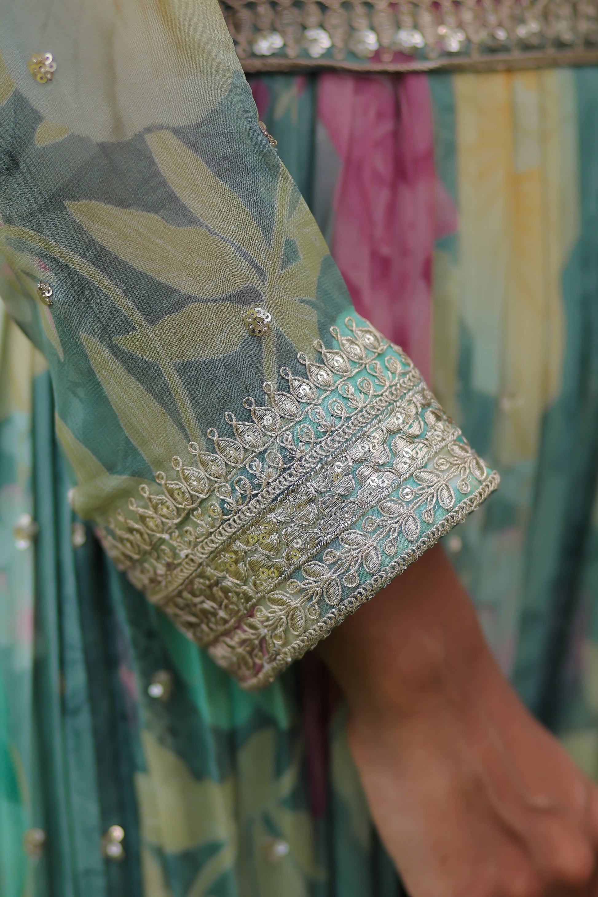 - Sap Green Floral Printed Anarkali With Straight Pants, Dupatta and Belt.