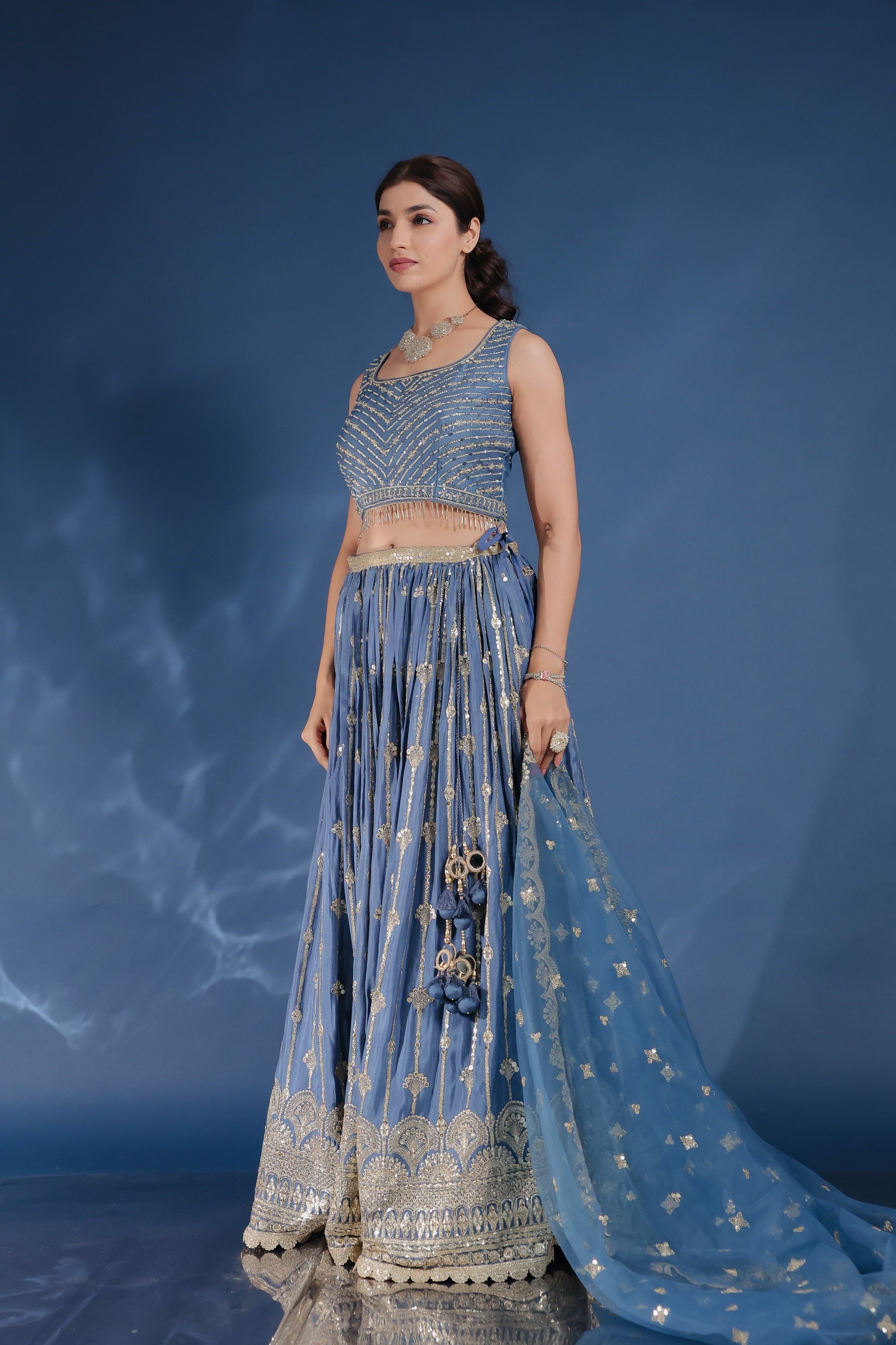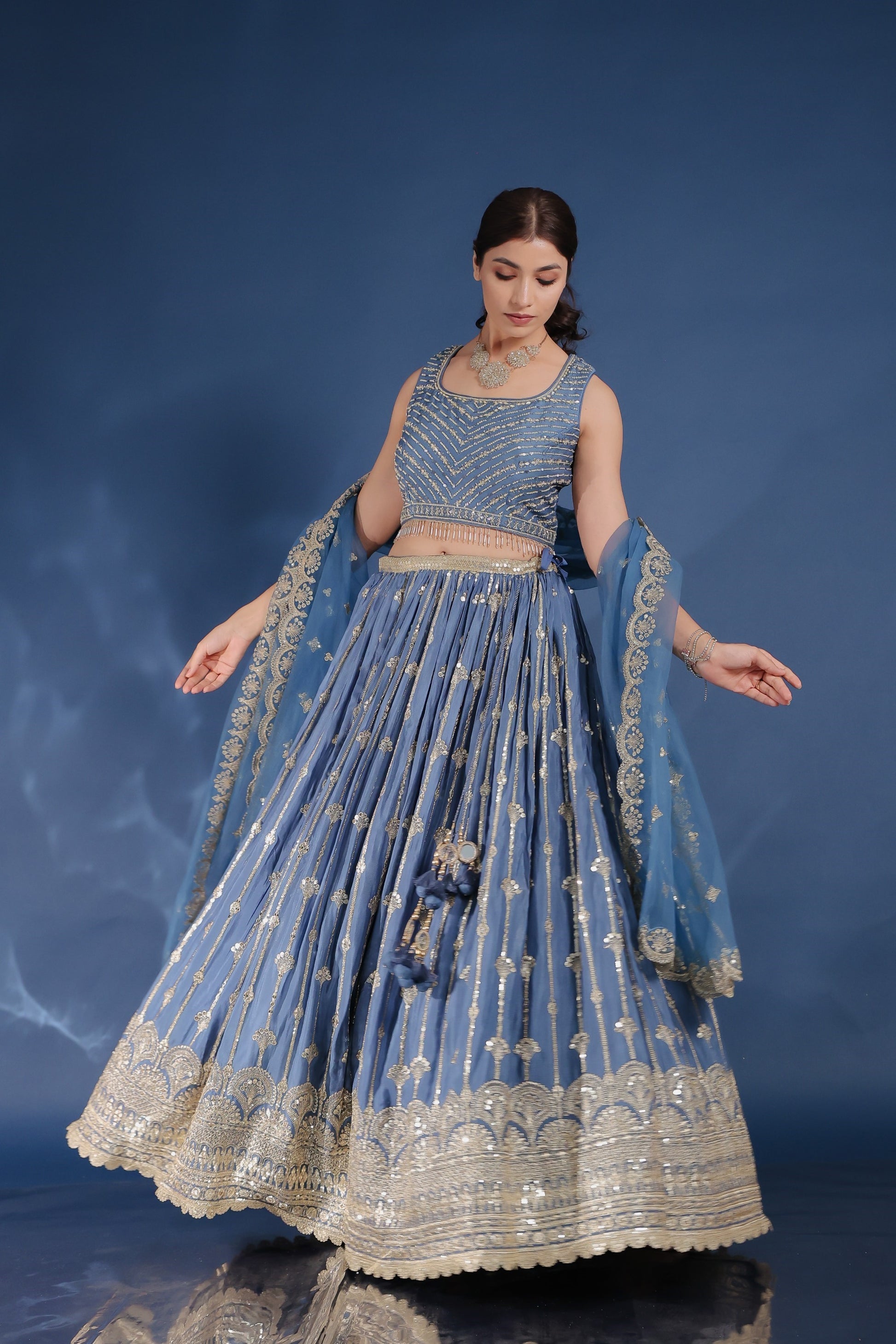 - Steel Blue Chinon Silk Lehenga And Crop Top With Zari And Sequin Work.
