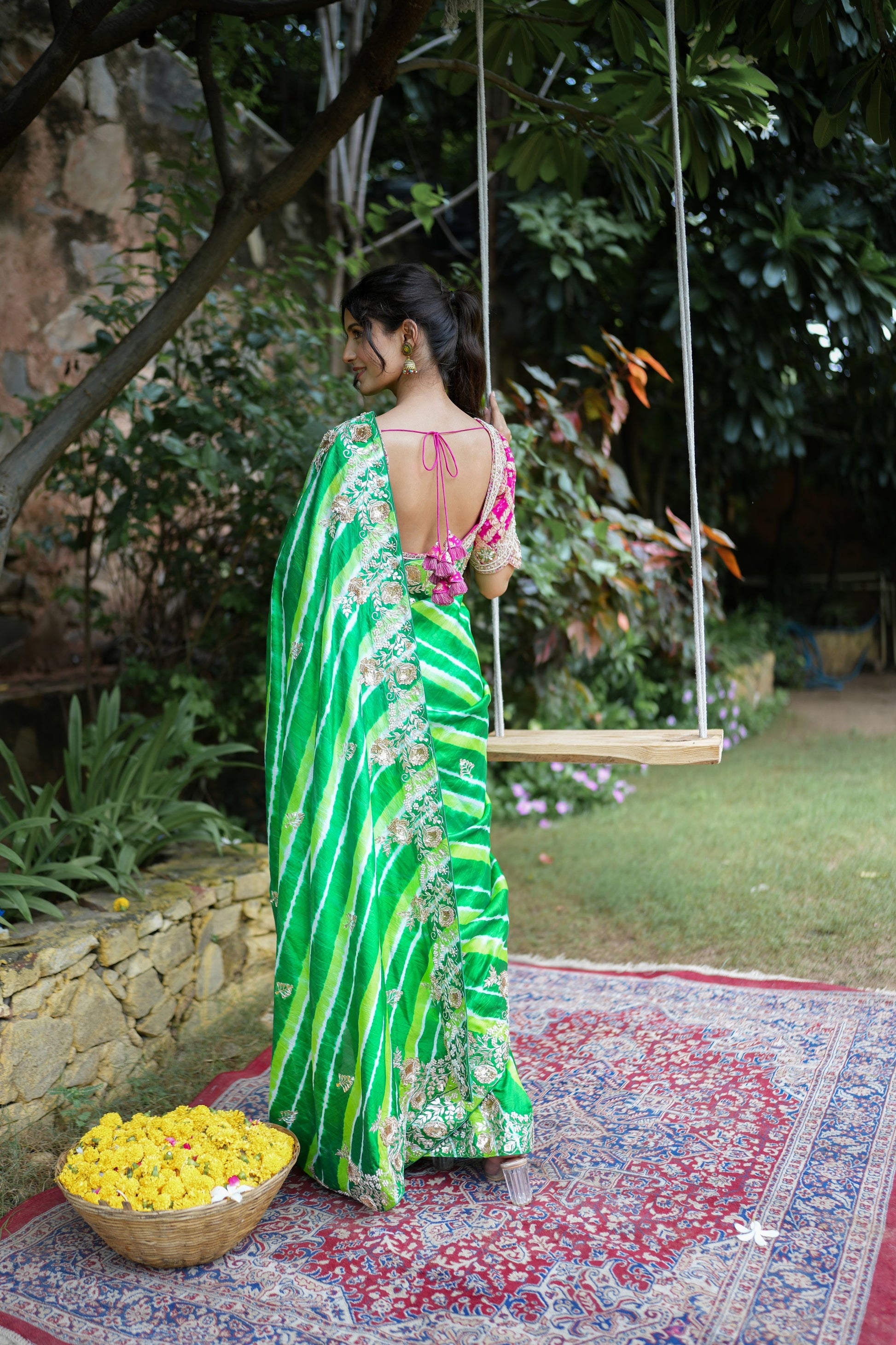 - The Leheriya Saree Have Shades Of Green With White Line.