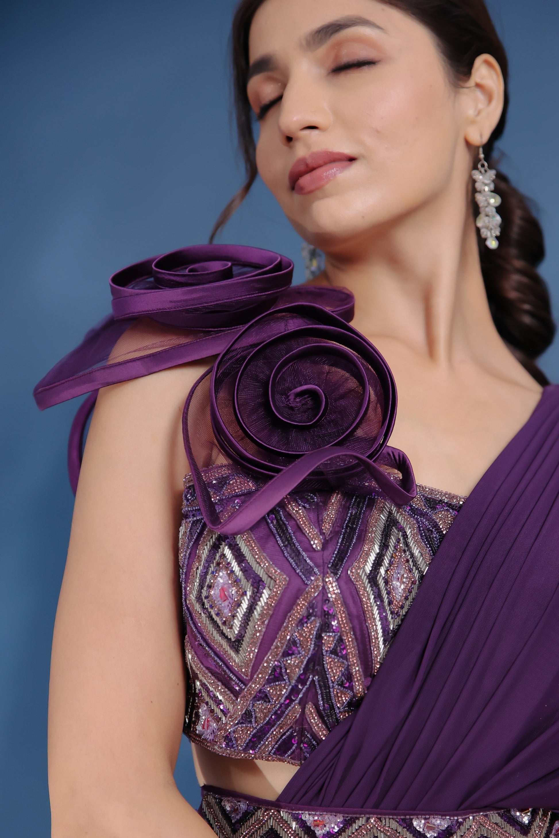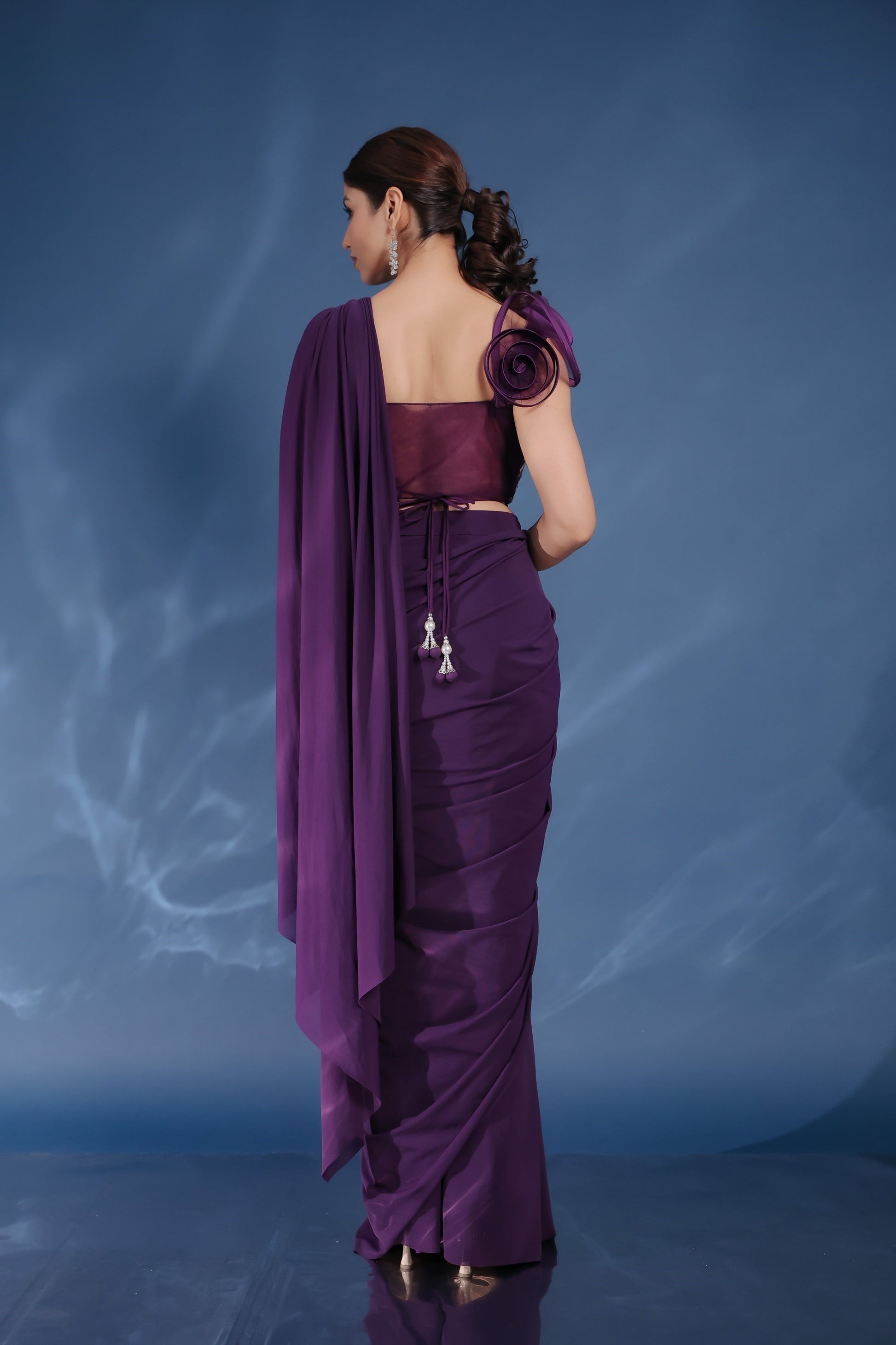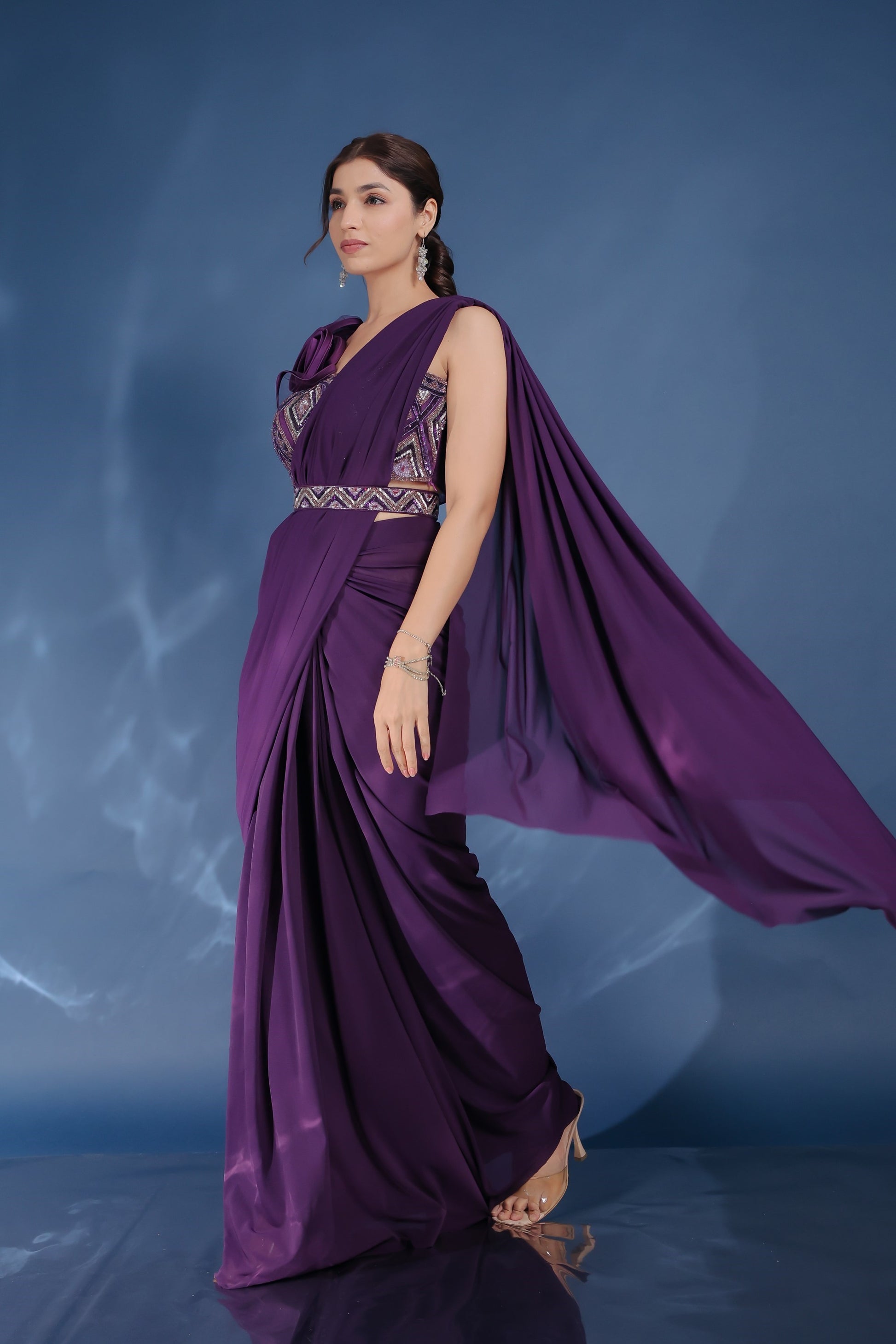 - Violet Italian Lycra Draper Saree With Embellished Crop Top.