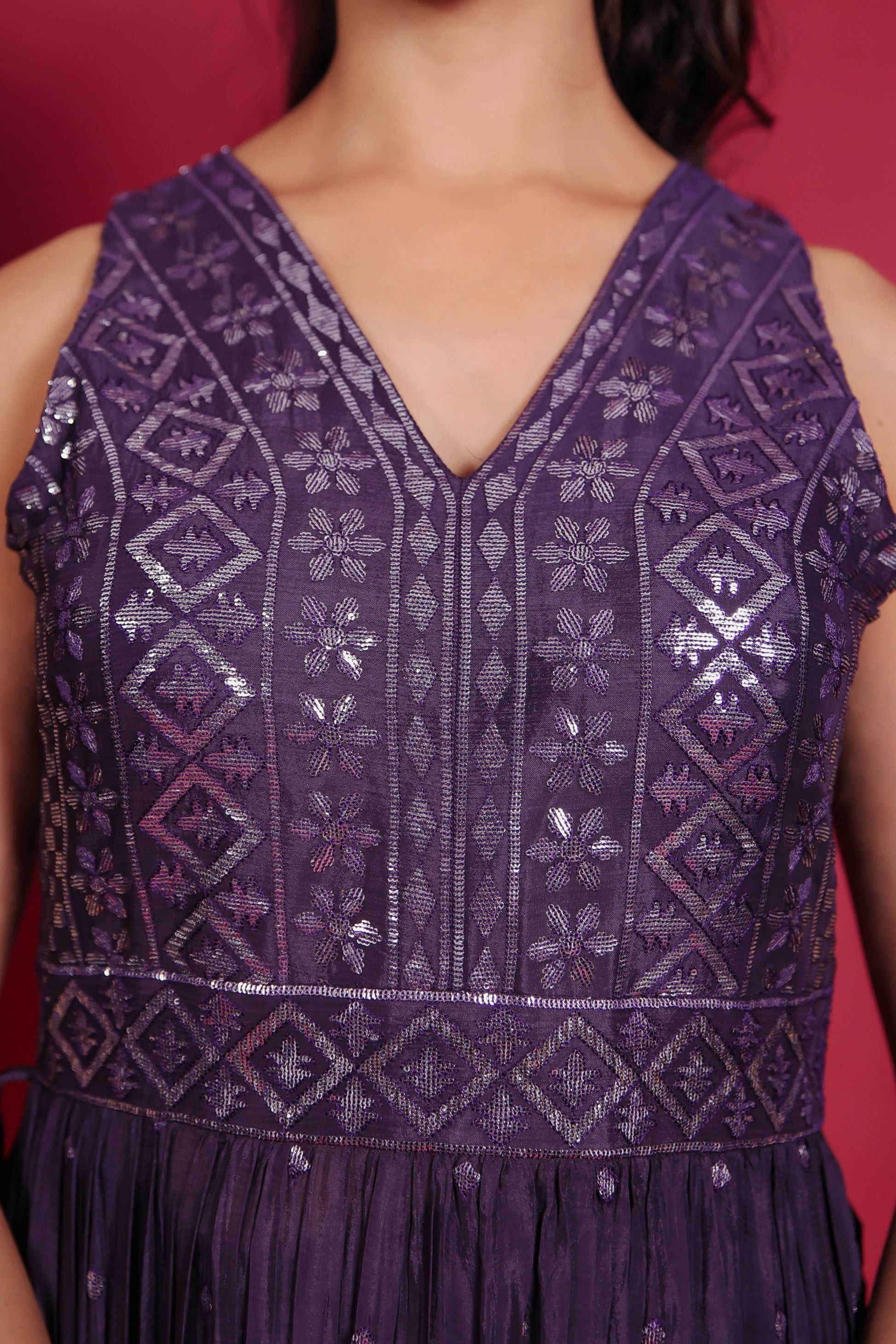 - The Kurta Is Cut Sleeve With V Neck Is Crafted With Sequin And Thread All Over The Bodice And Has the Same Border At The Hem.